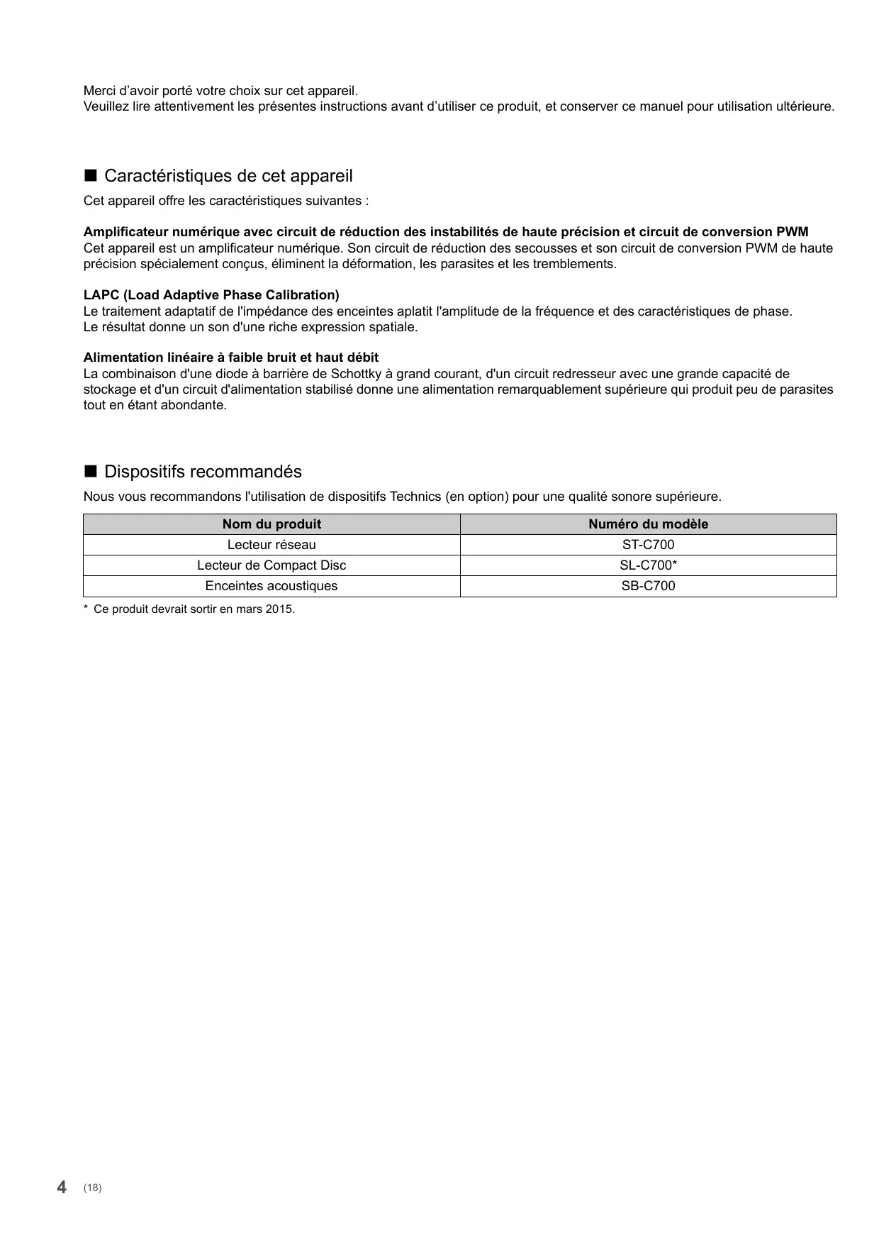 Nativer ASIO-Modus, DoP-Modus DSD64/DSD128-Wiedergabe 2 ch Merci d’avoir porté votre choix sur cet appareil. Veuillez lire attentivement les présentes instructions avant d’utiliser ce produit, et conserver ce manuel pour utilisation ultérieure. ∫ Caractéristiques de cet appareil Cet appareil offre les caractéristiques suivantes : Amplificateur numérique avec circuit de réduction des instabilités de haute précision et circuit de conversion PWM Cet appareil est un amplificateur numérique. Son circuit de réduction des secousses et son circuit de conversion PWM de haute précision spécialement conçus, éliminent la déformation, les parasites et les tremblements. LAPC (Load Adaptive Phase Calibration) Le traitement adaptatif de l'impédance des enceintes aplatit l'amplitude de la fréquence et des caractéristiques de phase. Le résultat donne un son d'une riche expression spatiale. Alimentation linéaire à faible bruit et haut débit La combinaison d'une diode à barrière de Schottky à grand courant, d'un circuit redresseur avec une grande capacité de stockage et d'un circuit d'alimentation stabilisé donne une alimentation remarquablement supérieure qui produit peu de parasites tout en étant abondante. ∫ Dispositifs recommandés Nous vous recommandons l'utilisation de dispositifs Technics (en option) pour une qualité sonore supérieure. Nom du produit Numéro du modèle Lecteur réseau ST-C700 Lecteur de Compact Disc SL-C700* Enceintes acoustiques SB-C700