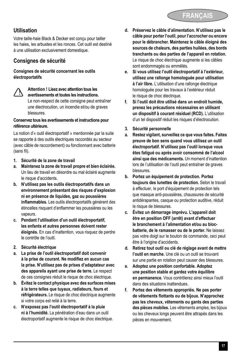 Vérifiez si l’alimentation mentionnée sur la plaque signalétique de l’outil correspond bien à la tension présente sur le lieu. Si le câble d'alimentation est endommagé, il doit être remplacé par le fabricant ou par un Centre de réparation agréé Black & Decker pour éviter tout risque d’accident. Utilisez un dispositif de courant résiduel à grande sensibilité, 30 mA (RCD) pour améliorer la sécurité électrique.