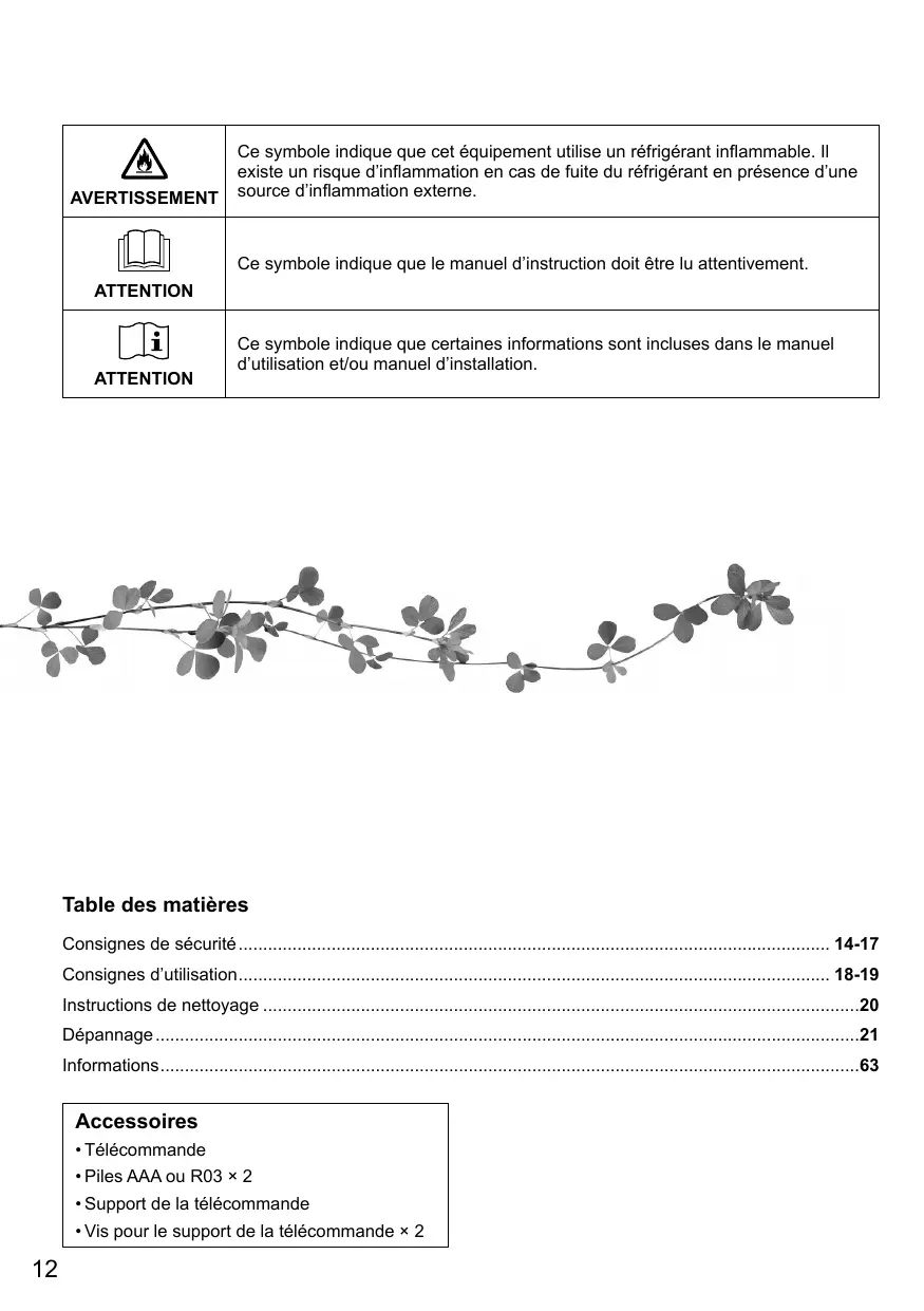 Pour éviter des blessures corporelles sur vousmême et sur les autres ou des dégâts matériels, respectez les instructions ci-dessous : Tout dysfonctionnement dû au non-respect des instructions peut occasionner des nuisances ou des dégâts dont la gravité est classée comme décrit ciaprès : L’appareil est rempli de R32 (réfrigérant inflammable doux). Il existe un risque d’incendie en cas de fuite du réfrigérant et d’exposition à une source d’inflammation externe.
