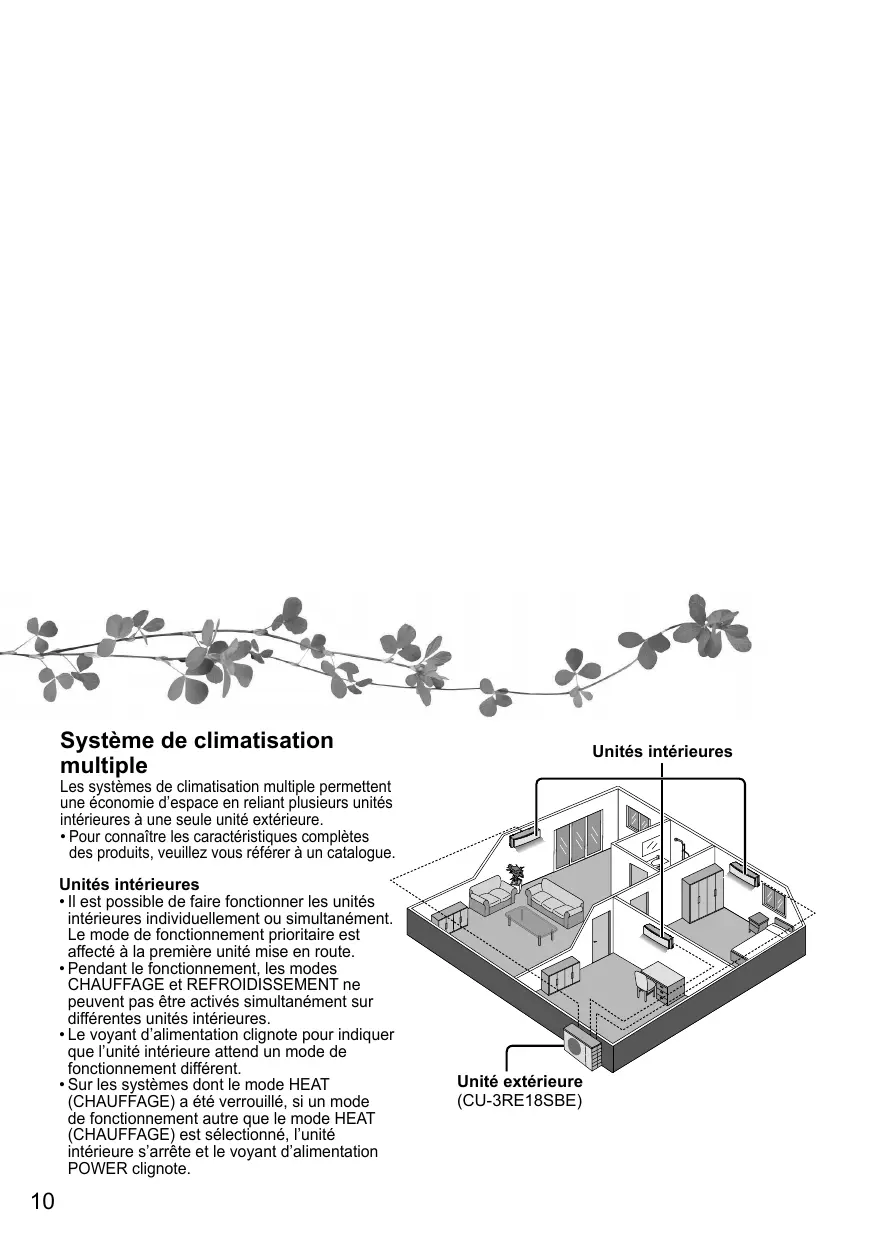 Nous vous remercions d’avoir porté votre choix sur un climatiseur Panasonic. Instructions d’installation jointes. Avant d’utiliser l’appareil, lisez ce mode d’emploi dans son intégralité et conservez-le pour toute référence ultérieure. Español Comment utiliser l’appareil Climatiseur Português Système de climatisation multiple Unités intérieures Les systèmes de climatisation multiple permettent une économie d’espace en reliant plusieurs unités intérieures à une seule unité extérieure.