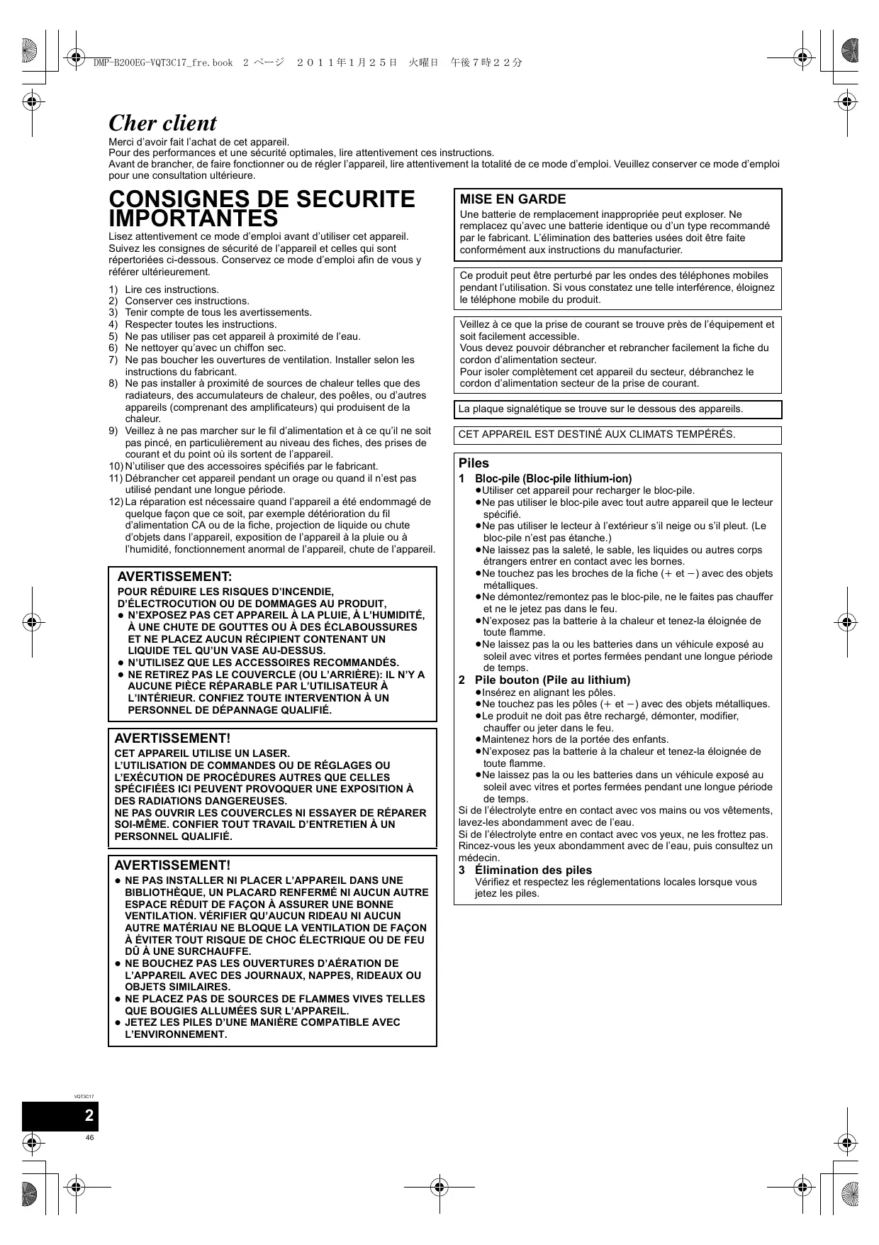 MODE D'EMPLOI DMP-B200EBK PANASONIC