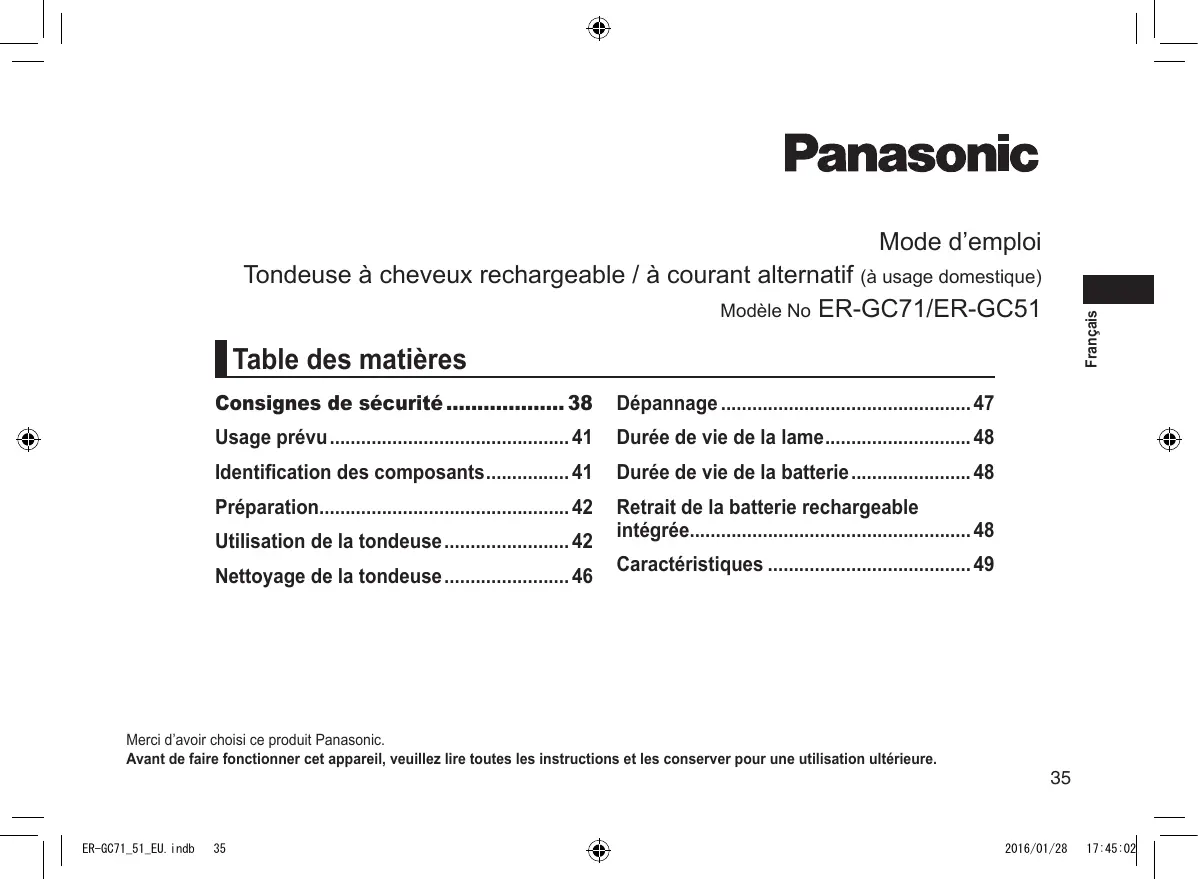 Retrouvez gratuitement la notice de l'appareil ER-GC51 PANASONIC au format PDF.