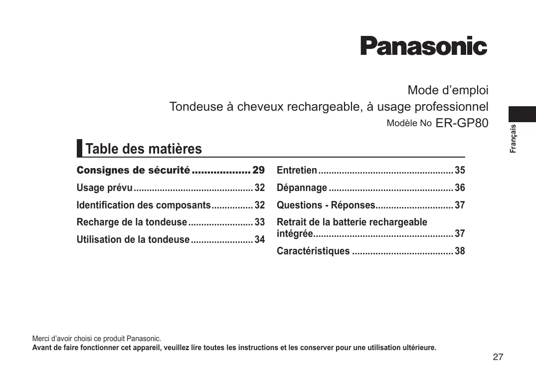 - Mode d’emploi Tondeuse à cheveux rechargeable, à usage professionnel Modèle No ER‑GP80 Consignes de sécurité p. 29