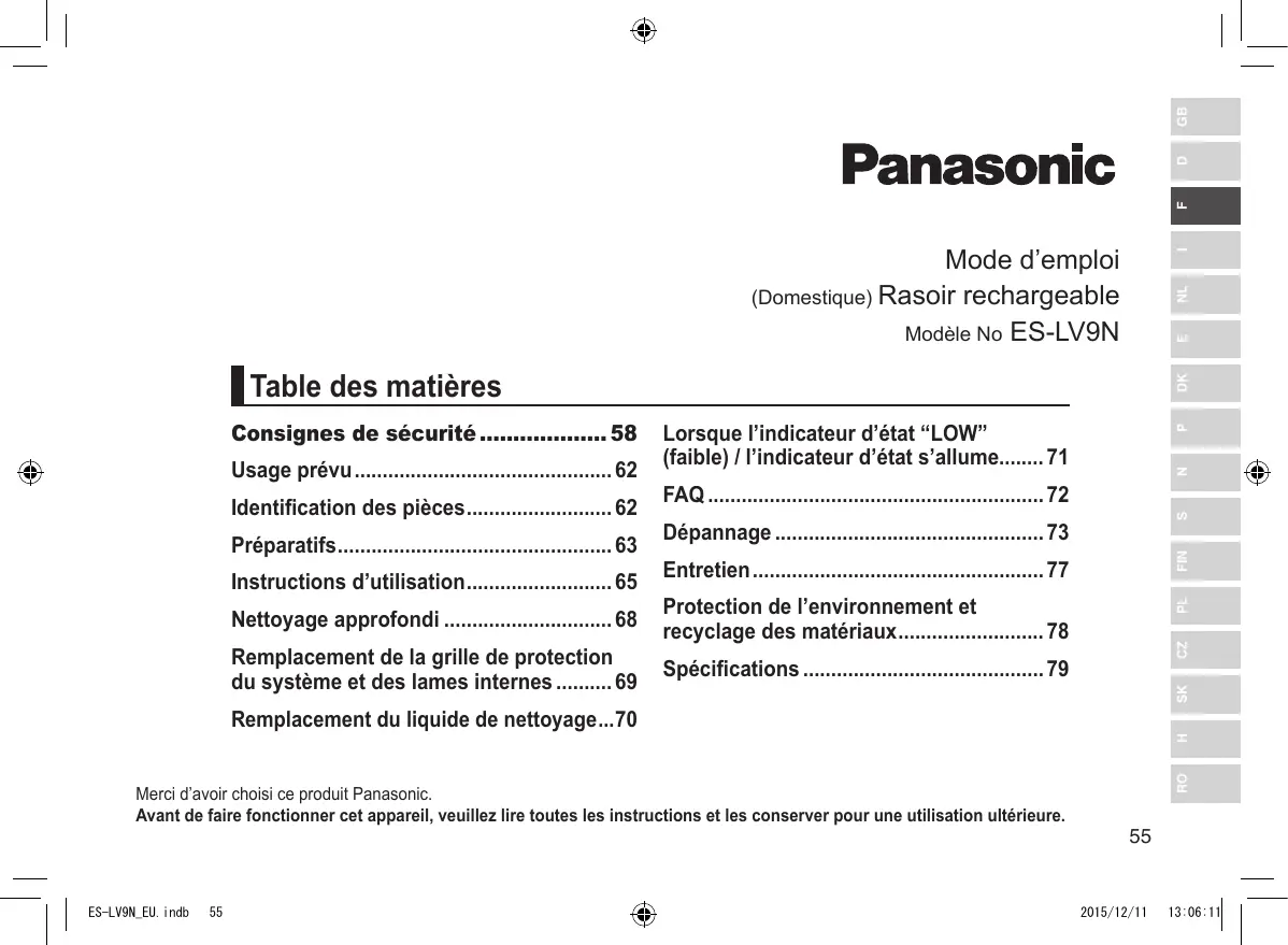 Mode d’emploi (Domestique) Rasoir rechargeable Modèle No ES‑LV9N Instructions d’utilisation........................... 65 Nettoyage approfondi............................... 68 Remplacement de la grille de protection du système et des lames internes........... 69