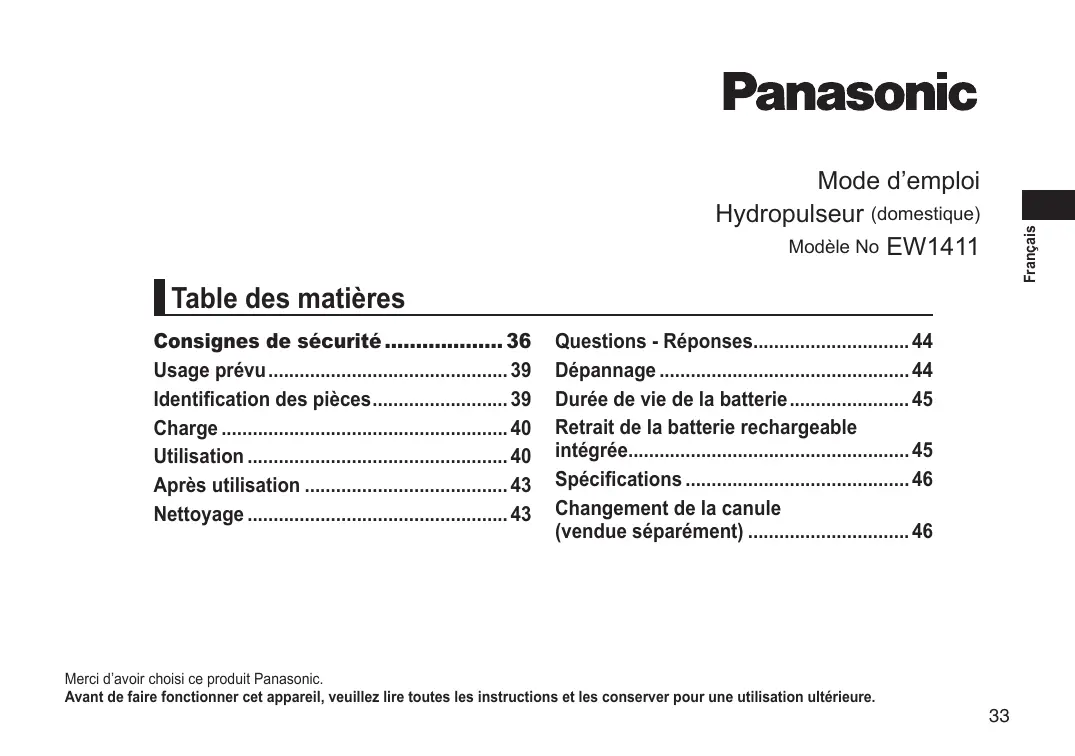 - Changement de la canule (vendue séparément) Merci d’avoir choisi ce produit Panasonic. Avant de faire fonctionner cet appareil, veuillez lire toutes les instructions et les conserver pour une utilisation ultérieure. p. 46