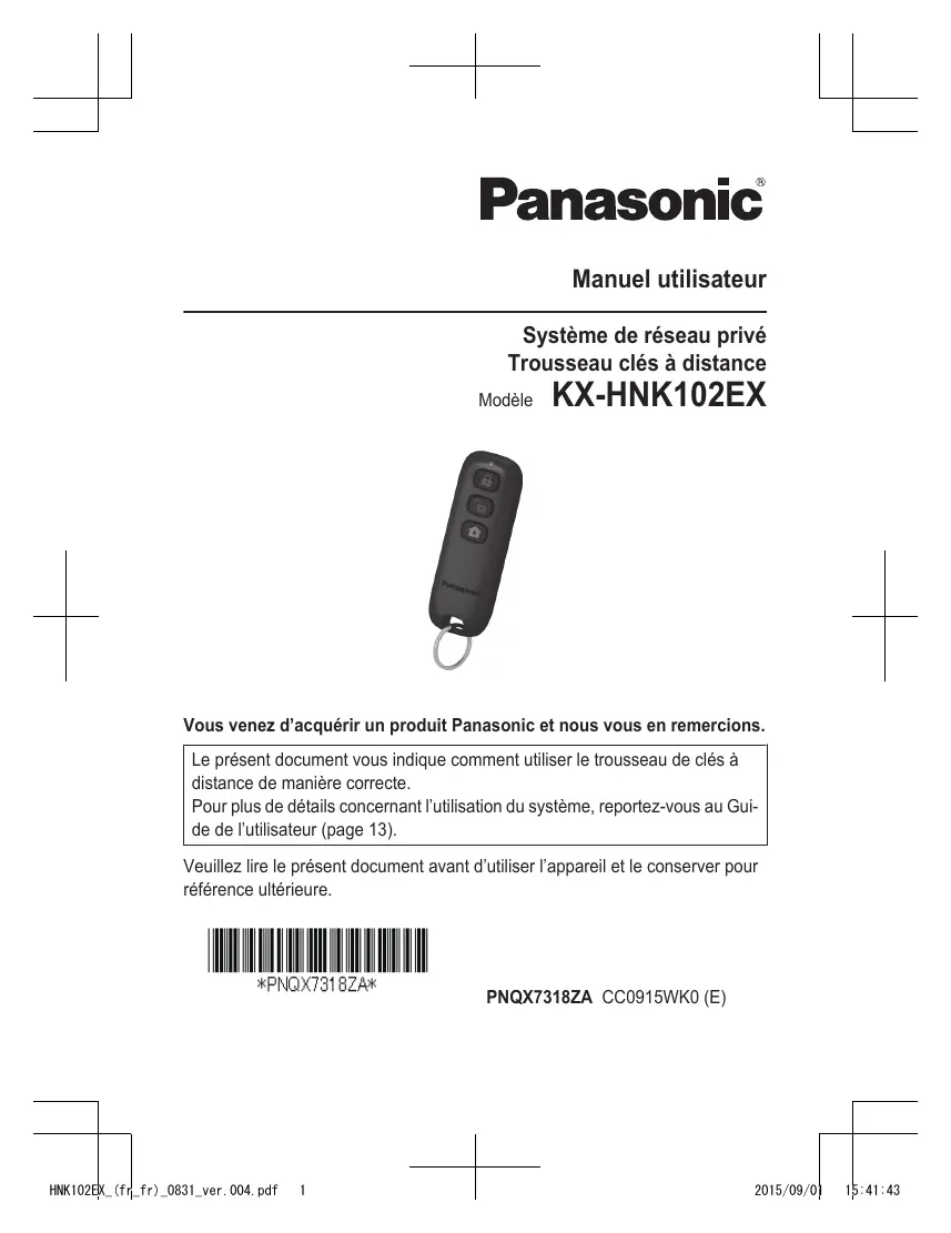 2015/09/01 15:32:28 Manuel utilisateur Système de réseau privé Trousseau clés à distance Modèle KX-HNK102EX Vous venez d’acquérir un produit Panasonic et nous vous en remercions. Le présent document vous indique comment utiliser le trousseau de clés à distance de manière correcte. Pour plus de détails concernant l’utilisation du système, reportez-vous au Guide de l’utilisateur (page 13). Veuillez lire le présent document avant d’utiliser l’appareil et le conserver pour référence ultérieure. PNQX7318ZA CC0915WK0 (E) HNK102EX_(fr_fr)_0831_ver.004.pdf
