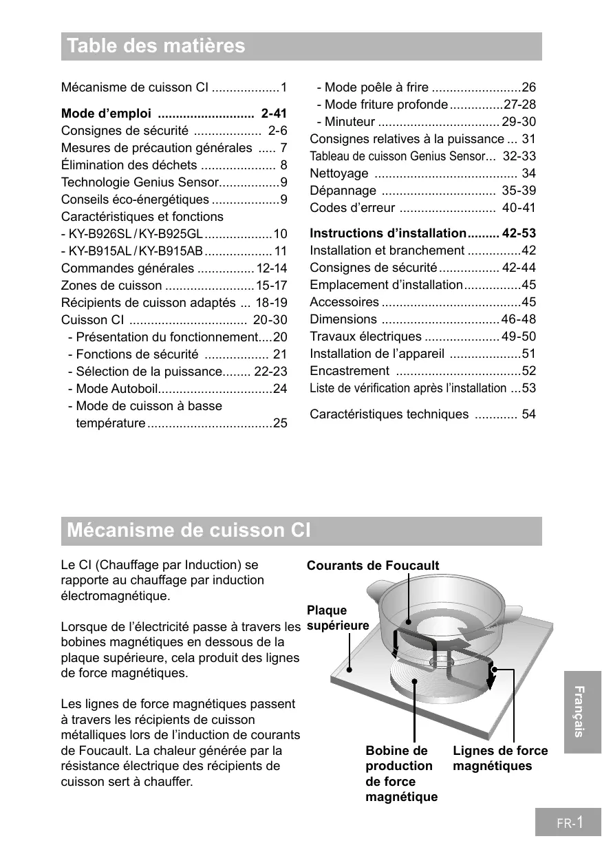 Signature de l’installateur FR- 53 Caractéristiques techniques Fabricant Identification de modèle KY-B926SL KY-B925GL Type de plaque Ce produit est conforme aux exigences de la norme EN 60350-2:2013 (Méthodes de mesure des performances - Plaques)