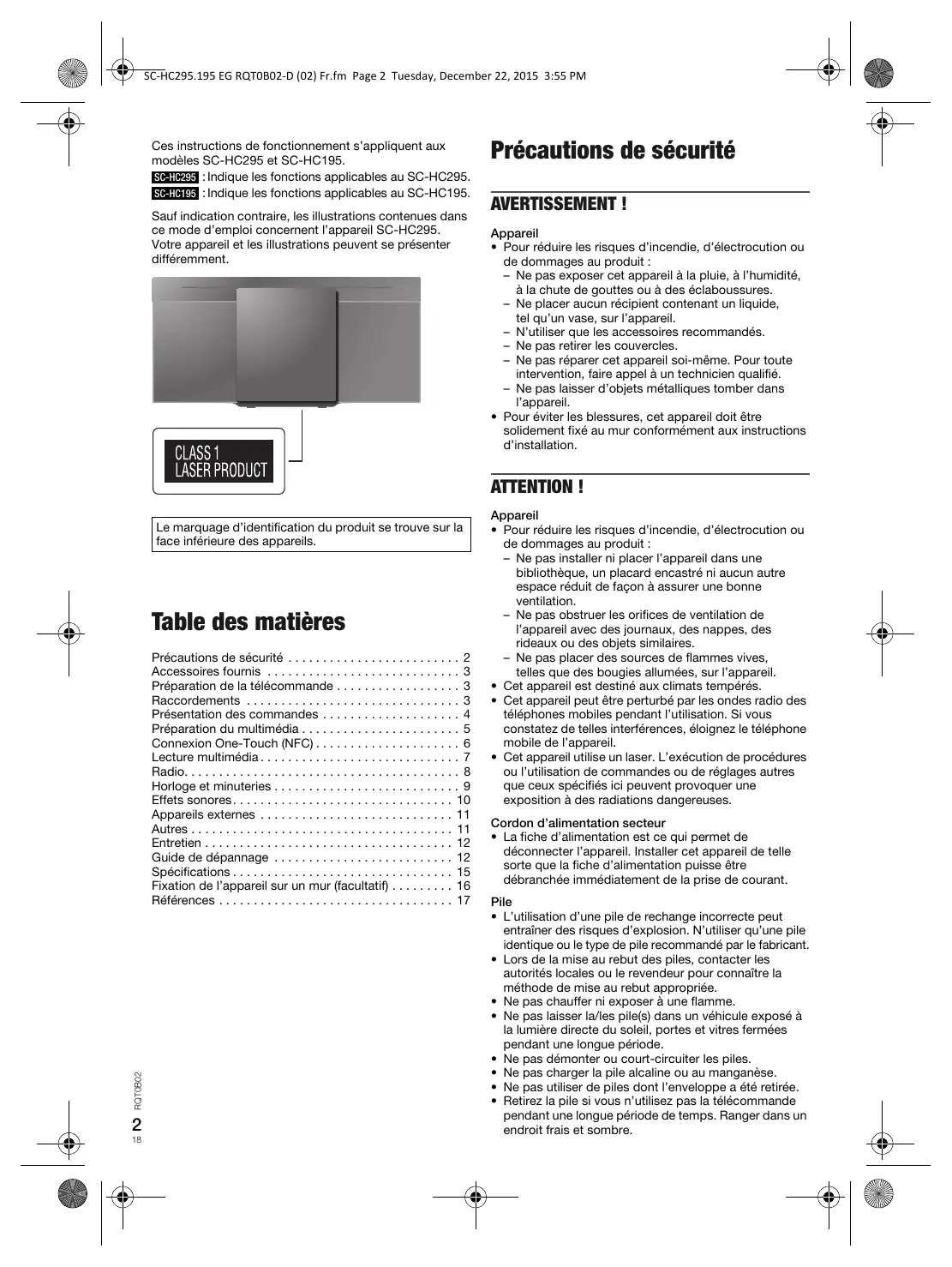 - Pour éviter les blessures, cet appareil doit être solidement fixé au mur conformément aux instructions d’installation. ATTENTION ! Le marquage d’identification du produit se trouve sur la face inférieure des appareils. Table des matières RQT0B02 Précautions de sécurité . . . . . . . . . . . . . . . . . . . . . . . . . 2 Accessoires fournis . . . . . . . . . . . . . . . . . . . . . . . . . . . . 3 Préparation de la télécommande . . . . . . . . . . . . . . . . . . 3 Raccordements . . . . . . . . . . . . . . . . . . . . . . . . . . . . . . . 3 Présentation des commandes . . . . . . . . . . . . . . . . . . . . 4 Préparation du multimédia . . . . . . . . . . . . . . . . . . . . . . . 5 Connexion One-Touch (NFC) . . . . . . . . . . . . . . . . . . . . . 6 Lecture multimédia . . . . . . . . . . . . . . . . . . . . . . . . . . . . . 7 Radio. . . . . . . . . . . . . . . . . . . . . . . . . . . . . . . . . . . . . . . . 8 Horloge et minuteries . . . . . . . . . . . . . . . . . . . . . . . . . . . 9 Effets sonores . . . . . . . . . . . . . . . . . . . . . . . . . . . . . . . . 10 Appareils externes . . . . . . . . . . . . . . . . . . . . . . . . . . . . 11 Autres . . . . . . . . . . . . . . . . . . . . . . . . . . . . . . . . . . . . . . 11 Entretien . . . . . . . . . . . . . . . . . . . . . . . . . . . . . . . . . . . . 12 Guide de dépannage . . . . . . . . . . . . . . . . . . . . . . . . . . 12 Spécifications . . . . . . . . . . . . . . . . . . . . . . . . . . . . . . . . 15 Fixation de l’appareil sur un mur (facultatif) . . . . . . . . . 16 Références . . . . . . . . . . . . . . . . . . . . . . . . . . . . . . . . . . 17