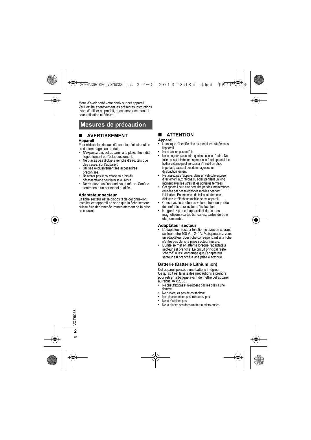 - L’unité se met en attente lorsque l’adaptateur secteur est branché. Le circuit principal reste “chargé” aussi longtemps que l’adaptateur secteur est branché à une prise électrique. Batterie (Batterie Lithium ion) VQT5C38 Cet appareil possède une batterie intégrée. Ce qui suit est la liste des précautions à prendre pour retirer la batterie avant de mettre cet appareil au rebut (> 82, 83).