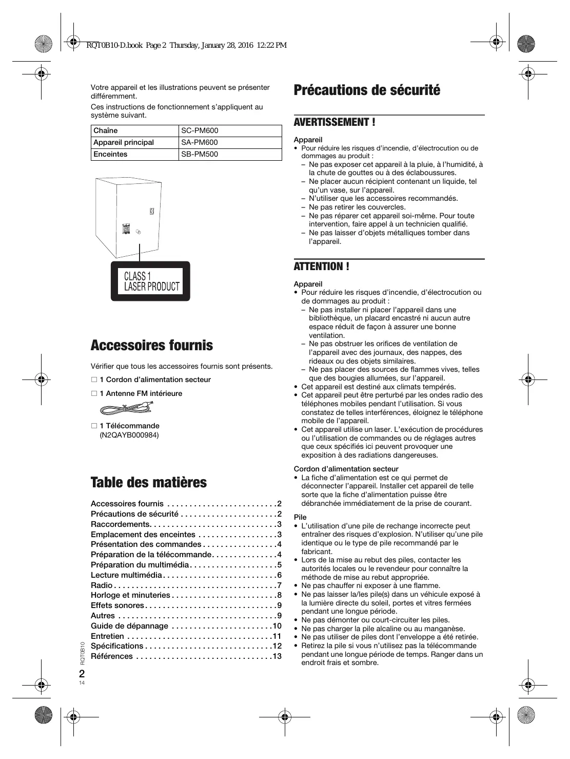 RQT0B10-D.book Page 2 Thursday, January 28, 2016 12:22 PM Votre appareil et les illustrations peuvent se présenter différemment. Ces instructions de fonctionnement s’appliquent au système suivant. Chaîne SC-PM600 Appareil principal SA-PM600 Enceintes SB-PM500 Précautions de sécurité AVERTISSEMENT ! Appareil
