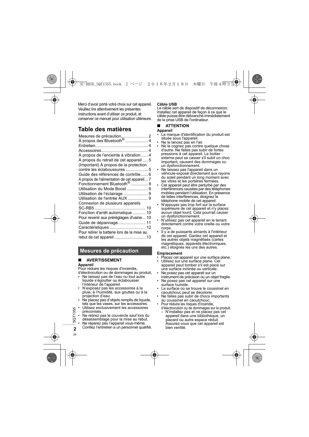 - Pour retirer la batterie lors de la mise au rebut de cet appareil Mesures de précaution SQT1355 p. 13