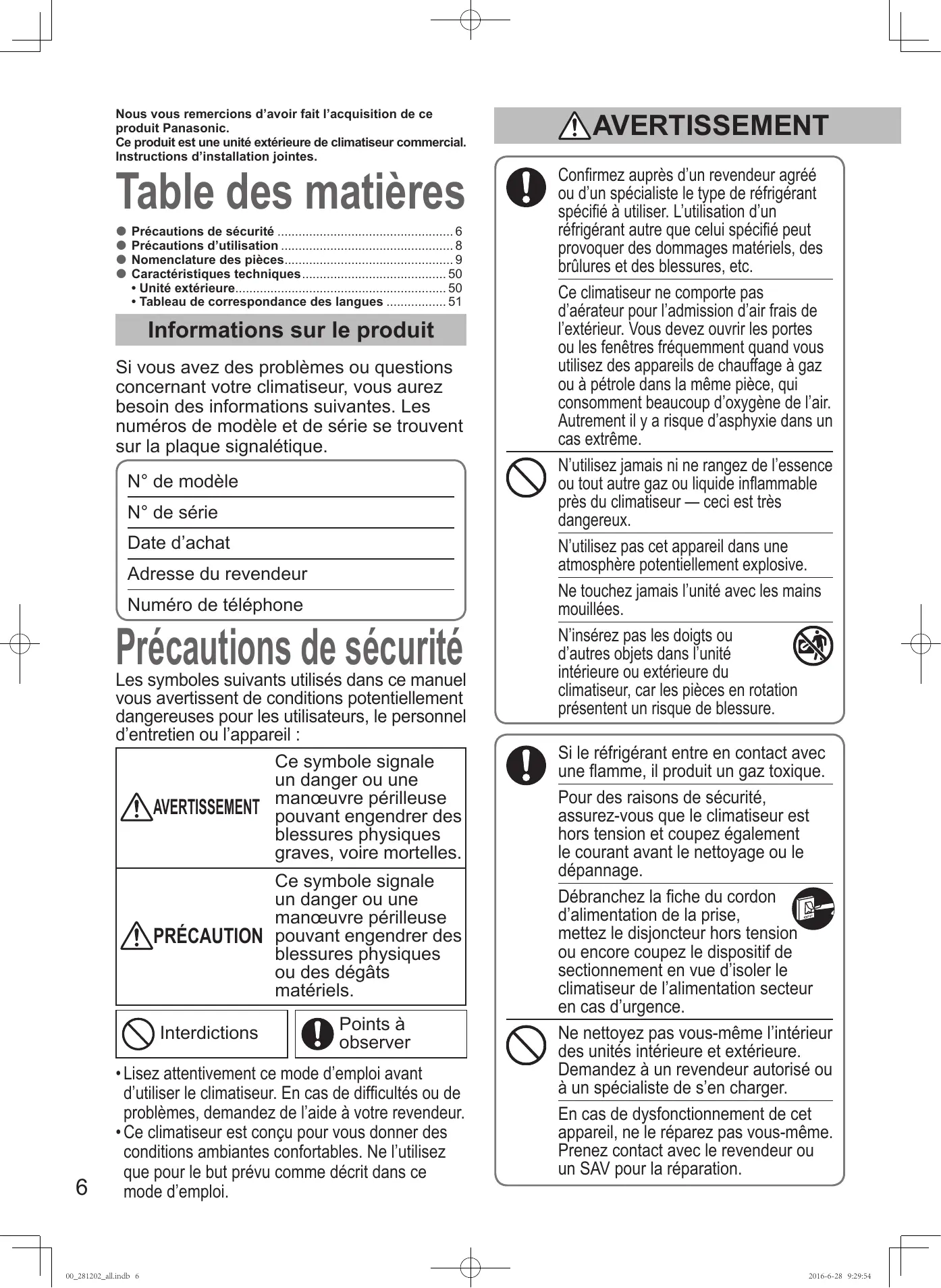 - ACXF55-03680 2016-6-28 9:29:47 Nous vous remercions d’avoir fait l’acquisition de ce produit Panasonic. Ce produit est une unité extérieure de climatiseur commercial. Instructions d’installation jointes. Table des matières Précautions de sécurité p. 6