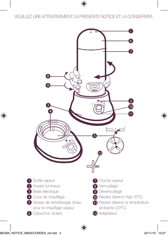 Vous avez acquis un appareil aux performances uniques. BIB’SECONDES fonctionne selon un procédé exclusif de réchauffage à la vapeur en milieu fermé piloté par un programmateur que l’on indexe sur la température initiale et le volume du liquide contenu dans le biberon ou sur le modèle du petit pot. 20°C : biberon ou petit pot initialement à température ambiante. 5°C : biberon ou petit pot sortant du réfrigérateur. Avec BIB’SECONDES, très rapidement, biberon et petit pot seront toujours réchauffés à la bonne température. MODE D’EMPLOI Fonction Chauffe-biberon • Verser de l’eau à température ambiante (~ 20°C) dans la cuve jusqu’au niveau-repère (voir schéma). • Placer l’adaptateur dans la cuve. • Placer le biberon à réchauffer sans capuchon, ni tétine, ni opercule. • Verrouiller la cloche à fond. • Brancher l’appareil. • Positionner le bouton programmateur sur la quantité de liquide à réchauffer, en tenant compte de la température de départ ( 20°C ou 5°C). • Appuyer sur le bouton programmateur pour lancer le cycle. Le voyant lumineux s’allume pour indiquer le lancement du cycle. • Le biberon est prêt à l’extinction du voyant lumineux. • Déverrouiller la cloche par son capuchon en prenant garde à la vapeur chaude pouvant s’échapper. Extraire le biberon en le saisissant par la partie remplie (partie vide très chaude) à l’aide d’un linge adapté. Le biberon peut être plus chaud que le liquide à l’intérieur. • Reboucher le biberon et l’agiter pour homogénéiser la température. • Verser quelques gouttes de liquide sur la face interne de votre poignet afin de vérifier la température du contenu du biberon avant de le donner à votre enfant. • Ne pas chauffer la nourriture pendant une durée trop longue. • Par mesure d’hygiène et afin d’éviter tout risque microbiologique, le biberon doit être consommé rapidement après préparation (dans les deux heures).Consultez votre pédiatre ou un organisme de santé pour plus d’information sur la sécurité et la préparation des aliments. • Si le biberon n’est pas assez chaud, relancer un cycle court en adaptant le temps de chauffe.