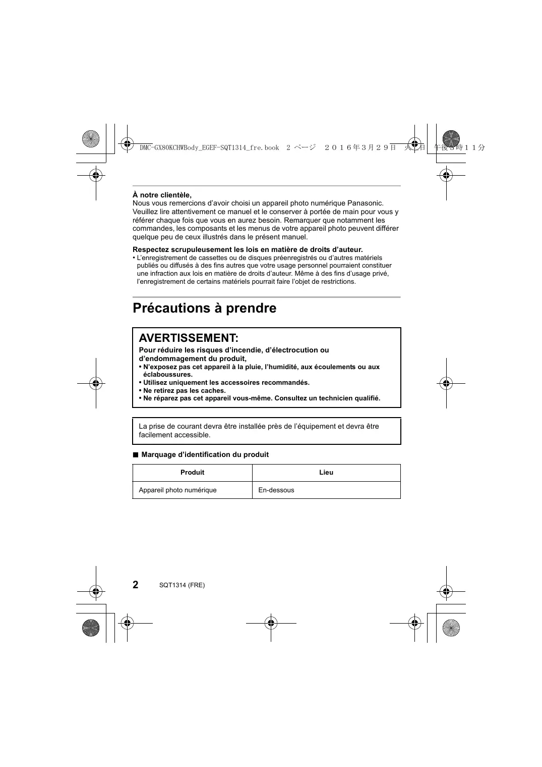 - Ne réparez pas cet appareil vous-même. Consultez un technicien qualifié. La prise de courant devra être installée près de l’équipement et devra être facilement accessible. ∫ Marquage d’identification du produit Produit Appareil photo numérique