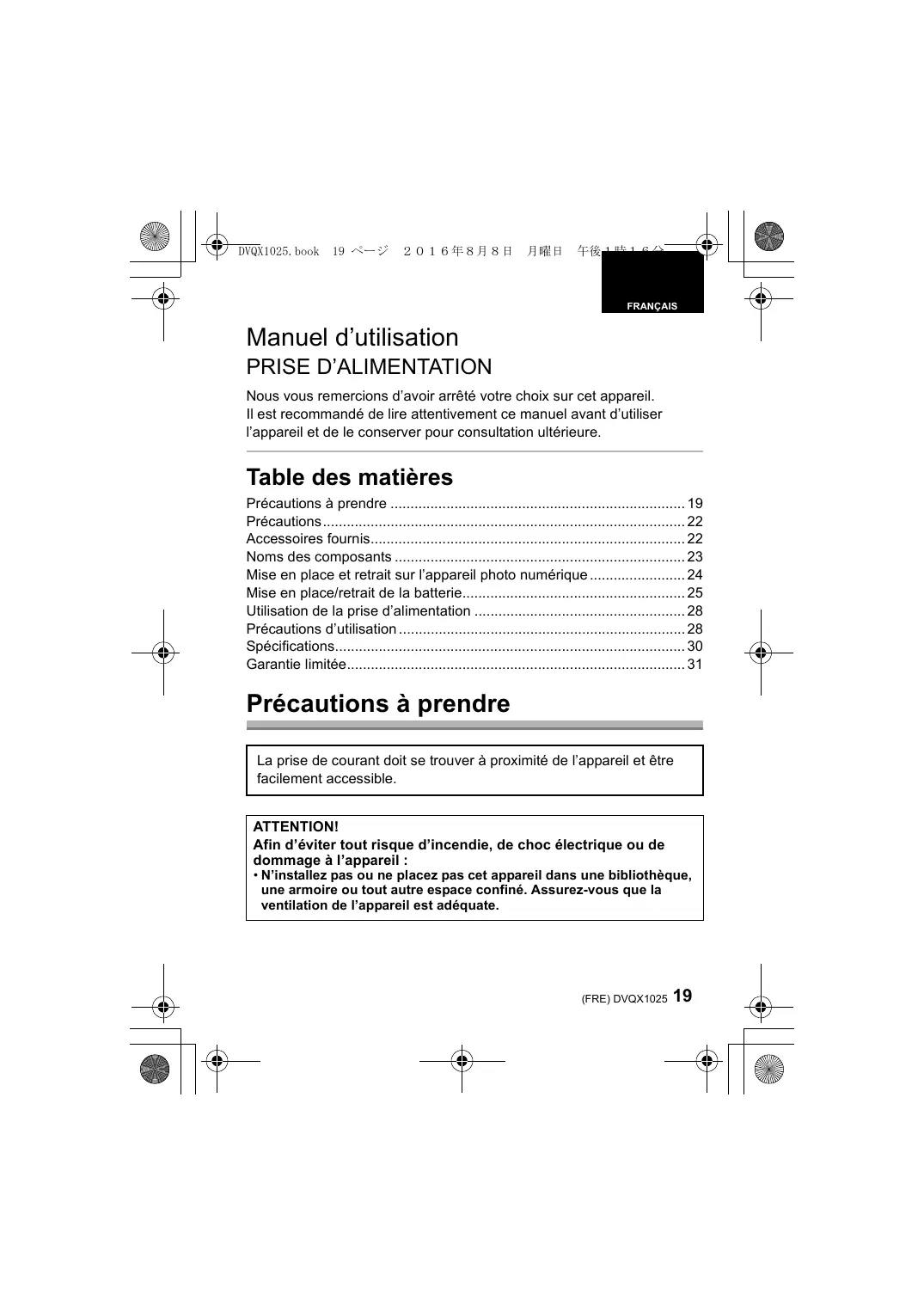 - Le capuchon de la prise est installé sur la prise d’alimentation au moment de l’achat. 22 DVQX1025 (FRE) DVKV1001Z DVQX1025.book 23 ページ 2016年8月8日