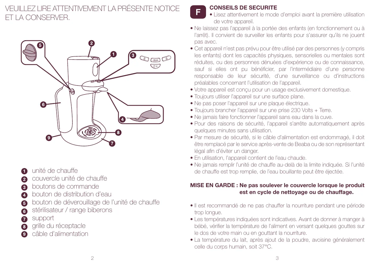 • Lisez attentivement le mode d’emploi avant la première utilisation de votre appareil. • Ne laissez pas l’appareil à la portée des enfants (en fonctionnement ou à l’arrêt). Il convient de surveiller les enfants pour s’assurer qu’ils ne jouent pas avec. • Cet appareil n’est pas prévu pour être utilisé par des personnes (y compris les enfants) dont les capacités physiques, sensorielles ou mentales sont réduites, ou des personnes dénuées d’expérience ou de connaissance, sauf si elles ont pu bénéficier, par l’intermédiaire d’une personne responsable de leur sécurité, d’une surveillance ou d’instructions préalables concernant l’utilisation de l’appareil. • Votre appareil est conçu pour un usage exclusivement domestique. • Toujours utiliser l’appareil sur une surface plane. • Ne pas poser l’appareil sur une plaque électrique. • Toujours brancher l’appareil sur une prise 230 Volts + Terre. • Ne jamais faire fonctionner l’appareil sans eau dans la cuve. • Pour des raisons de sécurité, l’appareil s’arrête automatiquement après quelques minutes sans utilisation. • Par mesure de sécurité, si le câble d’alimentation est endommagé, il doit être remplacé par le service après-vente de Beaba ou de son représentant légal afin d’éviter un danger. • En utilisation, l’appareil contient de l’eau chaude. • Ne jamais remplir l’unité de chauffe au-delà de la limite indiquée. Si l’unité de chauffe est trop remplie, de l’eau bouillante peut être éjectée. MISE EN GARDE : Ne pas soulever le couvercle lorsque le produit est en cycle de nettoyage ou de chauffage. • Il est recommandé de ne pas chauffer la nourriture pendant une période trop longue. • Les températures indiquées sont indicatives. Avant de donner à manger à bébé, vérifier la température de l’aliment en versant quelques gouttes sur le dos de votre main ou en gouttant la nourriture. • La température du lait, après ajout de la poudre, avoisine généralement celle du corps humain, soit 37°C. 3