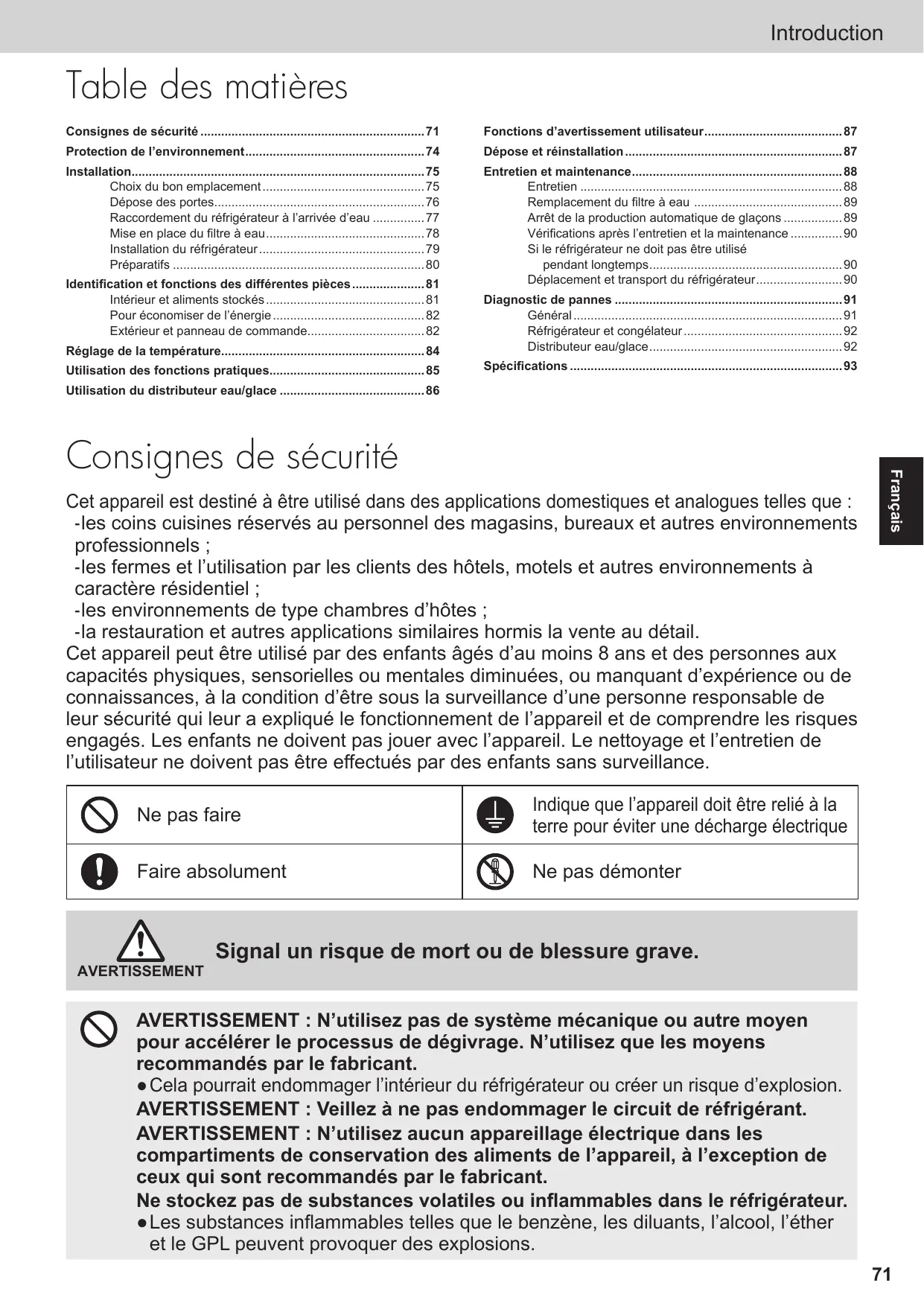 ●●Cela pourrait endommager l’intérieur du réfrigérateur ou créer un risque d’explosion. AVERTISSEMENT : Veillez à ne pas endommager le circuit de réfrigérant. AVERTISSEMENT : N’utilisez aucun appareillage électrique dans les compartiments de conservation des aliments de l’appareil, à l’exception de ceux qui sont recommandés par le fabricant. Ne stockez pas de substances volatiles ou inflammables dans le réfrigérateur. ●Les ● substances inflammables telles que le benzène, les diluants, l’alcool, l’éther et le GPL peuvent provoquer des explosions. 71