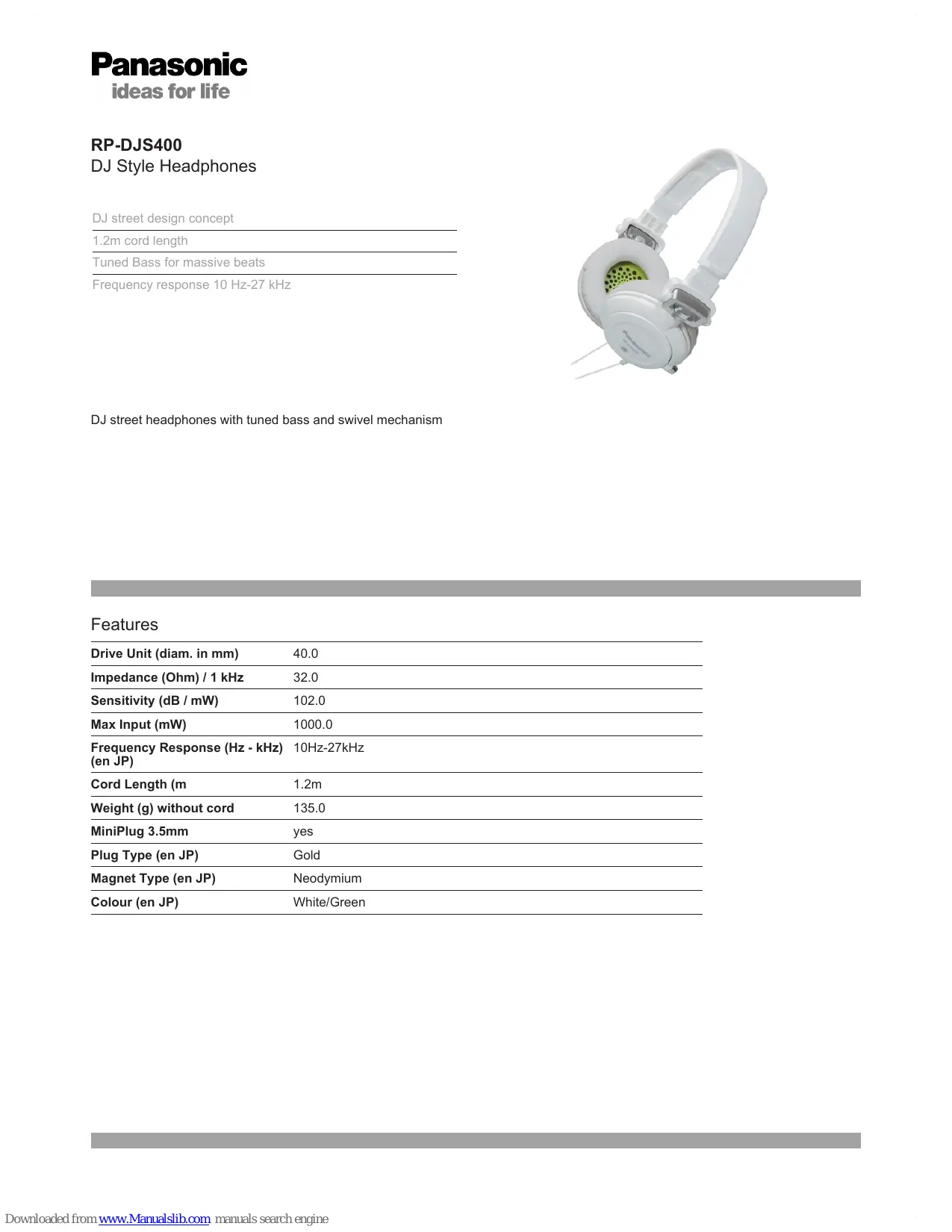 RP DJS400 - Casque audio PANASONIC - Notice d'utilisation et mode d'emploi gratuit