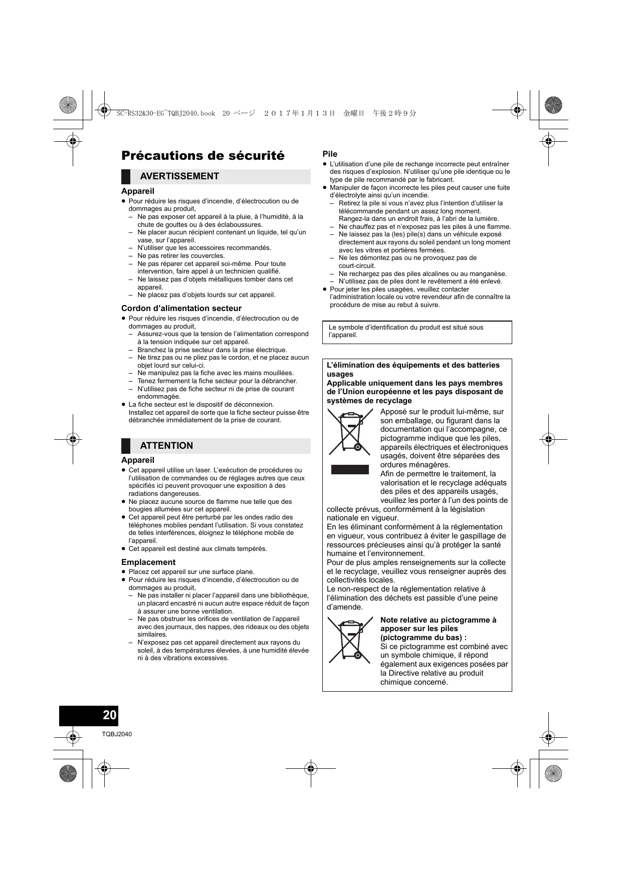 Pile ≥ L’utilisation d’une pile de rechange incorrecte peut entraîner des risques d’explosion. N’utiliser qu’une pile identique ou le type de pile recommandé par le fabricant. ≥ Manipuler de façon incorrecte les piles peut causer une fuite d’électrolyte ainsi qu’un incendie. – Retirez la pile si vous n’avez plus l’intention d’utiliser la télécommande pendant un assez long moment. Rangez-la dans un endroit frais, à l’abri de la lumière. – Ne chauffez pas et n’exposez pas les piles à une flamme. – Ne laissez pas la (les) pile(s) dans un véhicule exposé directement aux rayons du soleil pendant un long moment avec les vitres et portières fermées. – Ne les démontez pas ou ne provoquez pas de court-circuit. – Ne rechargez pas des piles alcalines ou au manganèse. – N’utilisez pas de piles dont le revêtement a été enlevé. ≥ Pour jeter les piles usagées, veuillez contacter l’administration locale ou votre revendeur afin de connaître la procédure de mise au rebut à suivre. Le symbole d’identification du produit est situé sous l’appareil. L’élimination des équipements et des batteries usages Applicable uniquement dans les pays membres de l’Union européenne et les pays disposant de systèmes de recyclage Apposé sur le produit lui-même, sur son emballage, ou figurant dans la documentation qui l’accompagne, ce pictogramme indique que les piles, appareils électriques et électroniques usagés, doivent être séparées des ordures ménagères. Afin de permettre le traitement, la valorisation et le recyclage adéquats des piles et des appareils usagés, veuillez les porter à l’un des points de collecte prévus, conformément à la législation nationale en vigueur. En les éliminant conformément à la réglementation en vigueur, vous contribuez à éviter le gaspillage de ressources précieuses ainsi qu’à protéger la santé humaine et l’environnement. Pour de plus amples renseignements sur la collecte et le recyclage, veuillez vous renseigner auprès des collectivités locales. Le non-respect de la réglementation relative à l’élimination des déchets est passible d’une peine d’amende. Note relative au pictogramme à apposer sur les piles (pictogramme du bas) : Si ce pictogramme est combiné avec un symbole chimique, il répond également aux exigences posées par la Directive relative au produit chimique concerné. SC-RS32&30-EG~TQBJ2040.book 21 ページ