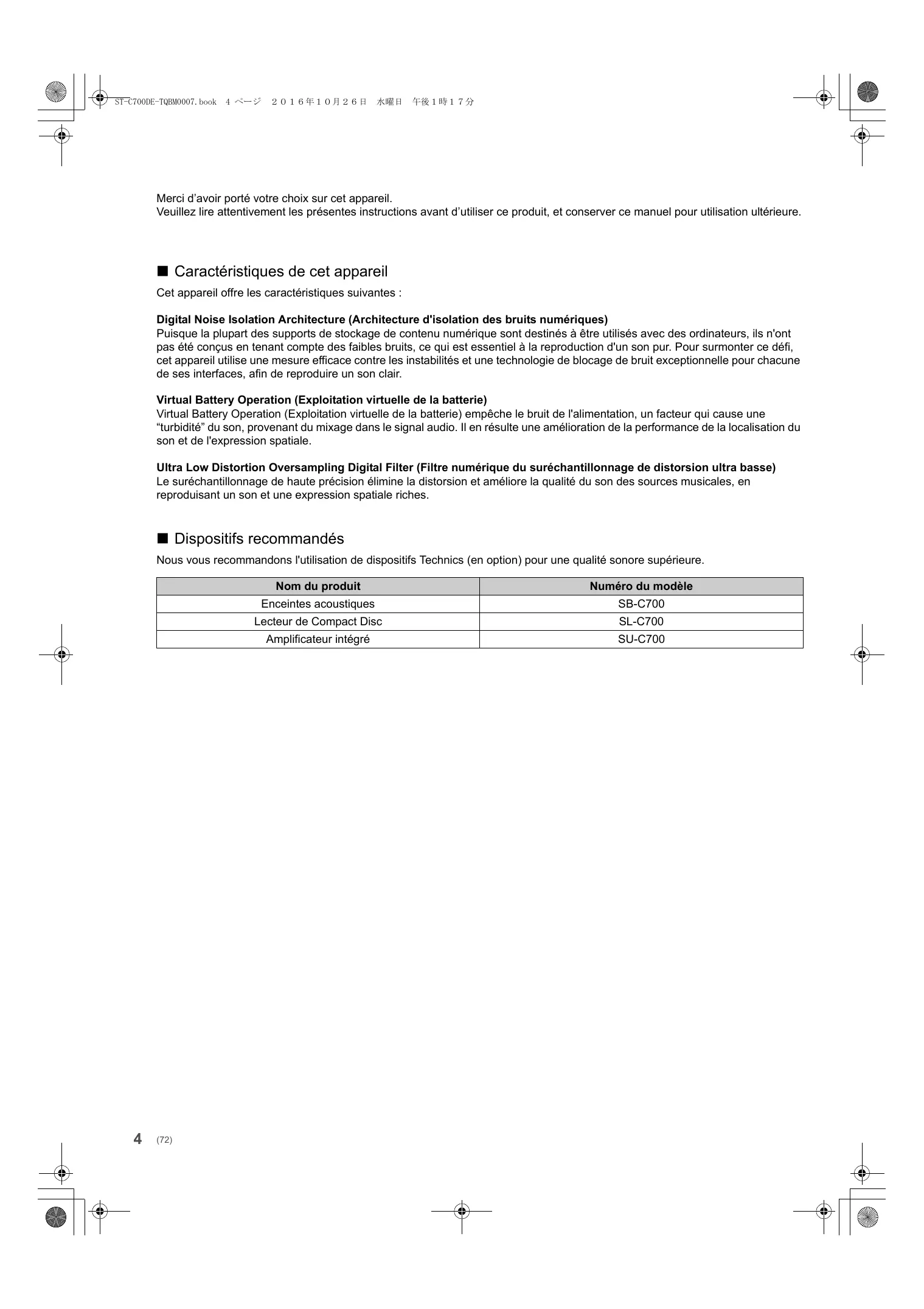 (72) Nom du produit Numéro du modèle Enceintes acoustiques SB-C700 Lecteur de Compact Disc SL-C700 Amplificateur intégré SU-C700 ST-C700DE-TQBM0007.book 5 ページ 2016年10月26日