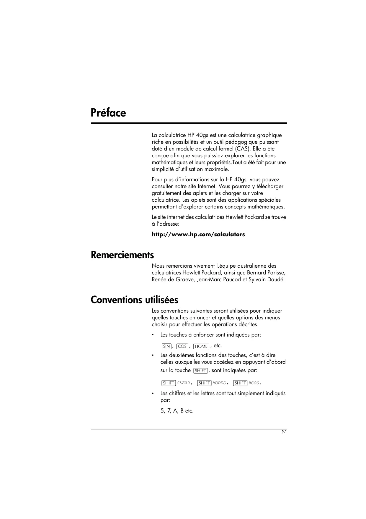 Table des matières Garantie limitée Service............................................................................ R-3 Informations de réglementation .......................................... R-5 Index Table des matières vii Préface La calculatrice HP 40gs est une calculatrice graphique riche en possibilités et un outil pédagogique puissant doté d'un module de calcul formel (CAS). Elle a été conçue afin que vous puissiez explorer les fonctions mathématiques et leurs propriétés.Tout a été fait pour une simplicité d’utilisation maximale. Pour plus d’informations sur la HP 40gs, vous pouvez consulter notre site Internet. Vous pourrez y télécharger gratuitement des aplets et les charger sur votre calculatrice. Les aplets sont des applications spéciales permettant d’explorer certains concepts mathématiques. Le site internet des calculatrices Hewlett Packard se trouve à l’adresse: http://www.hp.com/calculators Remerciements Nous remercions vivement l.équipe australienne des calculatrices Hewlett-Packard, ainsi que Bernard Parisse, Renée de Graeve, Jean-Marc Paucod et Sylvain Daudé. Conventions utilisées Les conventions suivantes seront utilisées pour indiquer quelles touches enfoncer et quelles options des menus choisir pour effectuer les opérations décrites.