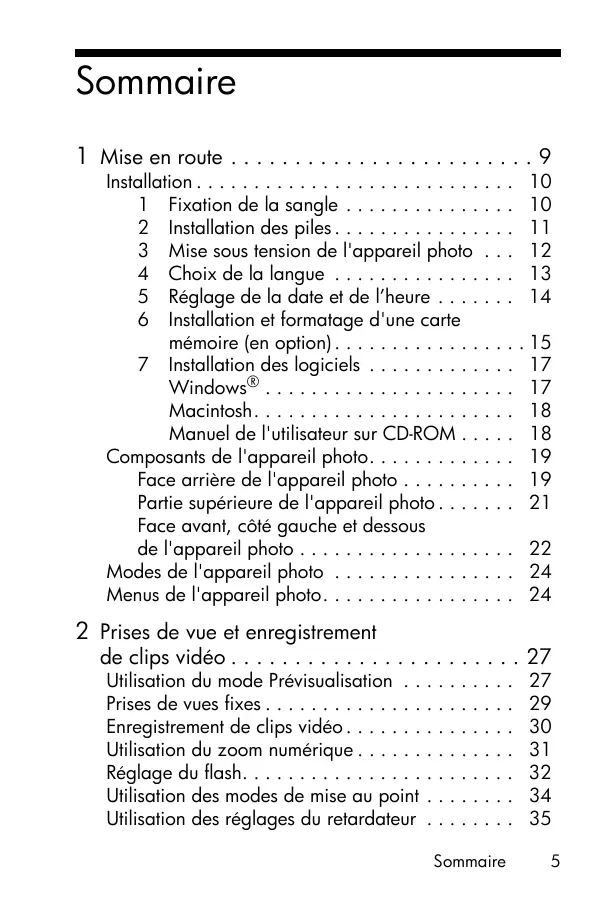 - Informations légales et remarques © Copyright 2005 Hewlett-Packard Development Company, L.P. Les informations contenues dans ce document sont sujettes à modification sans préavis. Les seules garanties pour les produits et les services HP sont énoncées dans les documents de garantie expresse accompagnant ces produits et services. Rien ici ne peut être interprété comme constituant une garantie supplémentaire. HP ne pourra être tenu pour responsable d'éventuelles erreurs ou omissions techniques ou rédactionnelles contenues dans ce document. Windows® est une marque déposée de Microsoft Corporation aux Etats-Unis. Le logo SD est une marque de son propriétaire. Informations importantes relatives au recyclage destinées à nos clients de l'Union européenne : Pour protéger l'environnement, ce produit doit être recyclé au terme de sa vie utile conformément à la législation en vigueur. Le symbole ci-dessous indique que ce produit ne doit pas être éliminé avec les déchets ordinaires. Veuillez retourner ce produit à l'établissement de collecte agréé le plus proche à des fins de recyclage/mise au rebut. Pour plus d'informations sur le retour et le recyclage de l'ensemble des produits HP, veuillez consulter le site : www.hp.com/hpinfo/globalcitizenship/environment/recycle/index.html Pour toute référence future, veuillez noter les informations suivantes : Numéro de modèle (figurant à l’avant de l’appareil) Numéro de série (nombre à 10 chiffres figurant sous l’appareil) Date d’achat de l’appareil photo Imprimé en Chine Sommaire 1 Mise en route p. 9