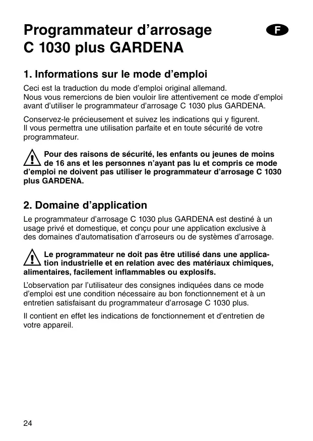 Ceci est la traduction du mode d’emploi original allemand. Nous vous remercions de bien vouloir lire attentivement ce mode d’emploi avant d’utiliser le programmateur d’arrosage C 1030 plus GARDENA. Conservez-le précieusement et suivez les indications qui y figurent. Il vous permettra une utilisation parfaite et en toute sécurité de votre programmateur. Pour des raisons de sécurité, les enfants ou jeunes de moins de 16 ans et les personnes n’ayant pas lu et compris ce mode d’emploi ne doivent pas utiliser le programmateur d’arrosage C 1030 plus GARDENA.
