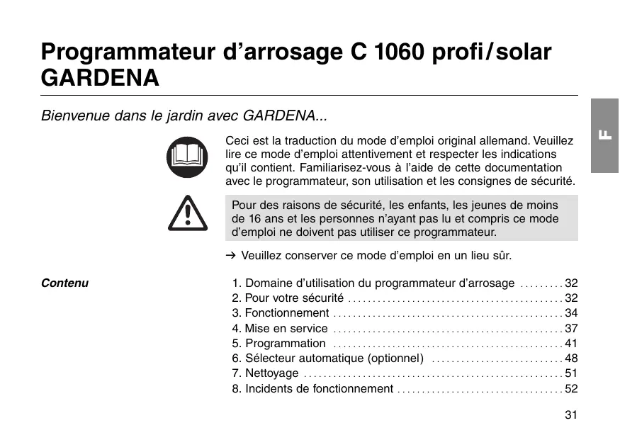 GARDENA Programmateur d’arrosage C 1060 profi / solar GARDENA Ceci est la traduction du mode d’emploi original allemand. Veuillez lire ce mode d’emploi attentivement et respecter les indications qu’il contient. Familiarisez-vous à l’aide de cette documentation avec le programmateur, son utilisation et les consignes de sécurité. Pour des raisons de sécurité, les enfants, les jeunes de moins de 16 ans et les personnes n’ayant pas lu et compris ce mode d’emploi ne doivent pas utiliser ce programmateur. v Veuillez conserver ce mode d’emploi en un lieu sûr. Contenu