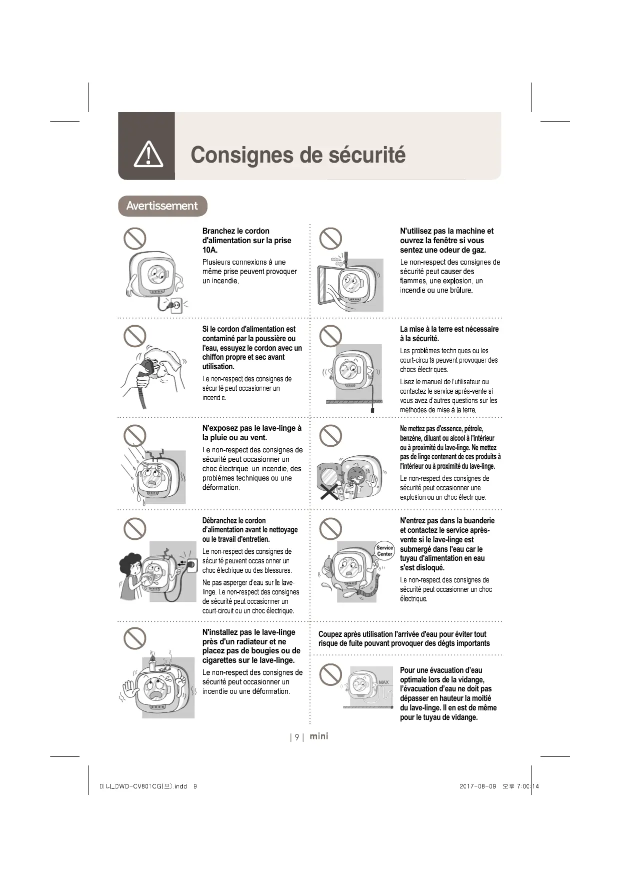 |ê| Caractéristiques du mini Ú±²½¬·±²- -°7½·¿´»- ¼» ³·²· æ Ô¿ª¿¹» ®¿°·¼» »¬ °«·--¿²¬ ¼» ¼·ª»®- ¬·--«- Þ¿½ ¼» ´»--·ª» »¬ ¼ù¿--±«°´·--¿²¬ Ô»- ¾¿½- ¼« ³·²· °±«® ¼7¬»®¹»²¬ »¬ ¿--±«°´·--¿²¬ -±²¬ ¼·-½®»¬- »¬ ¿³±ª·¾´»-ò Ô¿ ½±²½»°¬·±² »² º±®³» ¼» ½«·´´8®» ª±«°»®³»¬¬»²¬ ¼ù¿°°´·¯«»® ´¿ ¾±²²» ¯«¿²¬·¬7 ¼» ¼7¬»®¹»²¬ò |é| Consignes de sécurité Cet appareil ne doit pas être utilisé par des personnes (enfants inclus) aux capacités physiques, sensorielles ou mentales réduites, ou par des personnes manquant d'expérience et de connaissances, à moins qu’elles ne soient supervisées par une personne responsable de leur sécurité ou que cette personne leur ait donné les instructions nécessaires pour utiliser cet appareil. Avertissement N’utilisez pas le lave-linge si le cordon d'alimentation est endommagé ou n'est pas branché correctement. Si le lave-linge ne fonctionne pas ou si de la fumée ou des odeurs inhabituelles émanent de l'appareil, débranchez le lave-linge et contactez le service aprèsvente. Ne pas griffer, endommager, déformer, plier, tirer, tordre ou attacher le cordon d'alimentation. Ne pas placer ou insérer un objet lourd sur le cordon. Ne pas débrancher ou brancher le cordon en ayant les mains mouillées. Assurez-vous que la tension d'alimentation, la fréquence et le courant correspondent à la spécification du produit. Ne pas démonter, réparer ou reconstruire le lave-linge sans l'assistance de d'un professionnel qualifié. |è| Consignes de sécurité Avertissement Branchez le cordon d'alimentation sur la prise 10A. N'utilisez pas la machine et ouvrez la fenêtre si vous sentez une odeur de gaz. Si le cordon d'alimentation est contaminé par la poussière ou l'eau, essuyez le cordon avec un chiffon propre et sec avant utilisation. La mise à la terre est nécessaire à la sécurité. N'exposez pas le lave-linge à la pluie ou au vent. Ne mettez pas d'essence, pétrole, benzène, diluant ou alcool à l'intérieur ou à proximité du lave-linge. Ne mettez pas de linge contenant de ces produits à l'intérieur ou à proximité du lave-linge. Débranchez le cordon d’alimentation avant le nettoyage ou le travail d'entretien. N'entrez pas dans la buanderie et contactez le service aprèsvente si le lave-linge est submergé dans l'eau car le tuyau d'alimentation en eau s'est disloqué. N'installez pas le lave-linge près d'un radiateur et ne placez pas de bougies ou de cigarettes sur le lave-linge. Coupez après utilisation l'arrivée d'eau pour éviter tout risque de fuite pouvant provoquer des dégts importants Pour une évacuation d’eau optimale lors de la vidange, l’évacuation d’eau ne doit pas dépasser en hauteur la moitié du lave-linge. Il en est de même pour le tuyau de vidange. |ç| Consignes de sécurité Attention Ne mettez pas les mains ou des objets métalliques en dessous du lave-linge en cours de fonctionnement. En position de 'porte bloquée', n'ouvrez pas la porte en forçant. Ne laissez pas les enfants toucher au fonctionnement du lave-linge. Ne laissez pas les enfants monter sur le lave-linge ou mettre la tête dans la cuve à quelque moment que ce soit. Ne laissez pas les enfants se coincer les mains dans la porte et s'approcher du lavelinge. N'insérez pas les mains, de bâtons ou d'objets métalliques dans la cuve et ne touchez pas le linge en cours de lavage. Les enfants ou les personnes mal informés sur la méthode d'utilisation ne doivent pas utiliser le lavelinge. Installez le lave-linge dans un endroit où la prise de courant soit facilement accessible. Débranchez le cordon d'alimentation si vous n'allez pas utiliser le lave-linge pendant une longue période. N'utilisez pas d'objet pointu pour appuyer sur le bouton. | ïð | Consignes de sécurité Attention Ouvrez le robinet pour vérifier les fuites avant l'utilisation. Ne laissez pas d'animaux ou d'animaux familiers pénétrer dans la cuve du lave-linge. Ne faites pas fonctionner le lave-linge si le bac de lessive ou d'assouplissant n'est pas correctement enfoncé. Ne placez pas d'aimants à proximité du bouchon ou du lave-linge pendant le fonctionnement. Installez le lave-linge sur un mur solide et uniforme. N'utilisez pas de housse de lavage pour laver. Ne montez pas sur le lavelinge et ne placez pas d'objet lourd dessus. Contactez le service aprèsvente et ne faites pas fonctionner le lave-linge lorsqu'il est incliné ou en position horizontale. | ïï | Consignes de sécurité Attention Retirez tout résidu de lessive ou d'agents polluants sur le lave-linge avec un chiffon doux humide. Fermez la porte soigneusement pour éviter que le linge ne se coince dans la porte. Fermer le robinet après utilisation. Appuyez sur le bouton Démarrage après avoir fermé le robinet et ouvrez-le lentement ensuite lorsque l’alimentation d'eau reprend ou que le tuyau d’arrivée est reconnecté (ou en reprenant l'utilisation du lave-linge après une suspension prolongée) N'utilisez pas le lave-linge pour laver des articles non vestimentaires. (Chaussures, pomme de terre, chou, etc.) Placez la lessive et l'assouplissant dans les bacs réservés à cet effet de manière séparée. Ne lavez pas de vêtements imperméables et des articles tels que des vêtements de pluie, housses de voiture et sacs de couchage. Retirez toute lessive liquide et l'assouplissant contenus dans le lave-linge lorsque vous le déplacez. | ïî | Préparation 1 Raccorder le tuyau de vidange à la canalisation. 2 Raccordez le tuyau d’arrivée et ouvrez le robinet. 3 Branchez le cordon d’alimentation. - Ce lave-linge est disponible pour une utilisation à l'eau froide uniquement. Ne raccordez pas le tuyau d’arrivée au robinet d’eau chaude. | ïí | Pièces et accessoires Pièces Des tuyaux d’arrivée et d