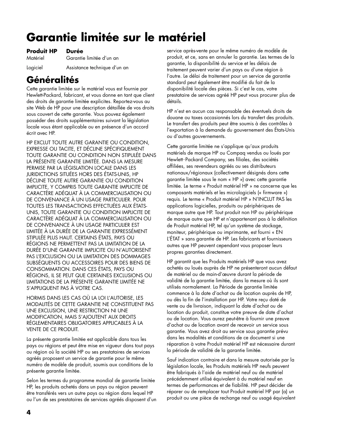 service après-vente pour le même numéro de modèle de produit, et ce, sans en annuler la garantie. Les termes de la garantie, la disponibilité du service et les délais de traitement peuvent varier d’un pays ou d’une région à l’autre. Le délai de traitement pour un service de garantie standard peut également être modifié du fait de la disponibilité locale des pièces. Si c’est le cas, votre prestataire de services agréé HP peut vous procurer plus de détails. HP n’est en aucun cas responsable des éventuels droits de douane ou taxes occasionnés lors du transfert des produits. Le transfert des produits peut être soumis à des contrôles à l’exportation à la demande du gouvernement des États-Unis ou d’autres gouvernements. Cette garantie limitée ne s’applique qu’aux produits matériels de marque HP ou Compaq vendus ou loués par Hewlett-Packard Company, ses filiales, des sociétés affiliées, ses revendeurs agréés ou ses distributeurs nationaux/régionaux (collectivement désignés dans cette garantie limitée sous le nom « HP ») avec cette garantie limitée. Le terme « Produit matériel HP » ne concerne que les composants matériels et les micrologiciels (« firmware ») requis. Le terme « Produit matériel HP » N’INCLUT PAS les applications logicielles, produits ou périphériques de marque autre que HP. Tout produit non HP ou périphérique de marque autre que HP et n’appartenant pas à la définition de Produit matériel HP, tel qu’un système de stockage, moniteur, périphérique ou imprimante, est fourni « EN L’ÉTAT » sans garantie de HP. Les fabricants et fournisseurs autres que HP peuvent cependant vous proposer leurs propres garanties directement. HP garantit que les Produits matériels HP que vous avez achetés ou loués auprès de HP ne présenteront aucun défaut de matériel ou de main-d’œuvre durant la période de validité de la garantie limitée, dans la mesure où ils sont utilisés normalement. La Période de garantie limitée commence à la date d’achat ou de location auprès de HP, ou dès la fin de l’installation par HP. Votre reçu daté de vente ou de livraison, indiquant la date d’achat ou de location du produit, constitue votre preuve de date d’achat ou de location. Vous aurez peut-être à fournir une preuve d’achat ou de location avant de recevoir un service sous garantie. Vous avez droit au service sous garantie prévu dans les modalités et conditions de ce document si une réparation à votre Produit matériel HP est nécessaire durant la période de validité de la garantie limitée. Sauf indication contraire et dans la mesure autorisée par la législation locale, les Produits matériels HP neufs peuvent être fabriqués à l’aide de matériel neuf ou de matériel précédemment utilisé équivalent à du matériel neuf en termes de performances et de fiabilité. HP peut décider de réparer ou de remplacer tout Produit matériel HP par (a) un produit ou une pièce de rechange neuf ou usagé équivalent à du matériel neuf en termes de performances et de fiabilité, ou par (b) un produit équivalent dans le cas d’un produit original en fin de série. Les pièces de rechange sont garanties contre tout défaut de matériau ou de maind’œuvre pendant quatre-vingt-dix (90) jours ou jusqu’à la fin de la période de validité de la garantie limitée du Produit matériel HP qu’elles remplacent ou dans lequel elles sont utilisées, selon la plus longue de ces deux périodes. Durant la période de validité de la garantie limitée, HP pourra réparer ou remplacer à sa discrétion tout composant ou matériel présentant des vices de matériel et de fabrication. Les composants et les produits matériels enlevés dans le cadre de cette garantie limitée deviennent propriété de HP. Dans l’éventualité peu probable où votre Produit matériel HP présenterait des erreurs ou défauts récurrents, la société HP pourra à son entière discrétion décider (a) de vous fournir un modèle de remplacement de son choix identique ou équivalent en termes de performances à votre Produit matériel HP, ou (b) de vous rembourser intégralement le prix d’achat ou de location (déduction faite des intérêts, le cas échéant) en lieu et place d’un échange. Ces clauses constituent votre recours exclusif en cas de défectuosité du produit. Exclusions La société HP ne garantit pas le fonctionnement sans interruption ou sans erreur de ce produit. La société HP n’est pas responsable des dommages résultant du fait que vous n’avez pas suivi les instructions destinées au Produit matériel HP. La présente garantie limitée ne s’applique pas aux consommables ; elle devient nulle lorsque le numéro de série du produit a été enlevé, ou lorsque ce produit a été endommagé ou rendu inopérant (a) par un accident, une utilisation inappropriée ou abusive, une contamination, un entretien ou un étalonnage inadéquats, ou par toute autre cause étrangère ; (b) à la suite d’un fonctionnement hors des paramètres d’utilisation définis dans la documentation livrée avec le produit ; (c) à cause de logiciels, d’interfaces, de pièces ou de fournitures non fournis par HP ; (d) à cause d’un mauvais entretien ou d’un lieu d’installation mal préparé ; (e) à la suite d’une contamination par virus ; (f) à la suite d’une perte ou de dommages survenus en transit ; ou (g) à cause d’une modification ou d’une intervention effectuées par une tierce partie, c.-à-d. qui n’est pas (i) HP, (ii) un centre de services agréé HP, ou (iii) une installation par vous-même de pièces HP remplaçables ou de pièces homologuées par HP lorsqu’elles sont disponibles pour votre produit dans la région/le pays du service. VOUS DEVEZ RÉALISER PÉRIODIQUEMENT DES COPIES DE SÉCURITÉ DES DONNÉES ENREGISTRÉES SUR VOTRE DISQUE DUR OU D’AUTRES SUPPORTS DE STOCKAGE, POUR VOUS PROTÉG