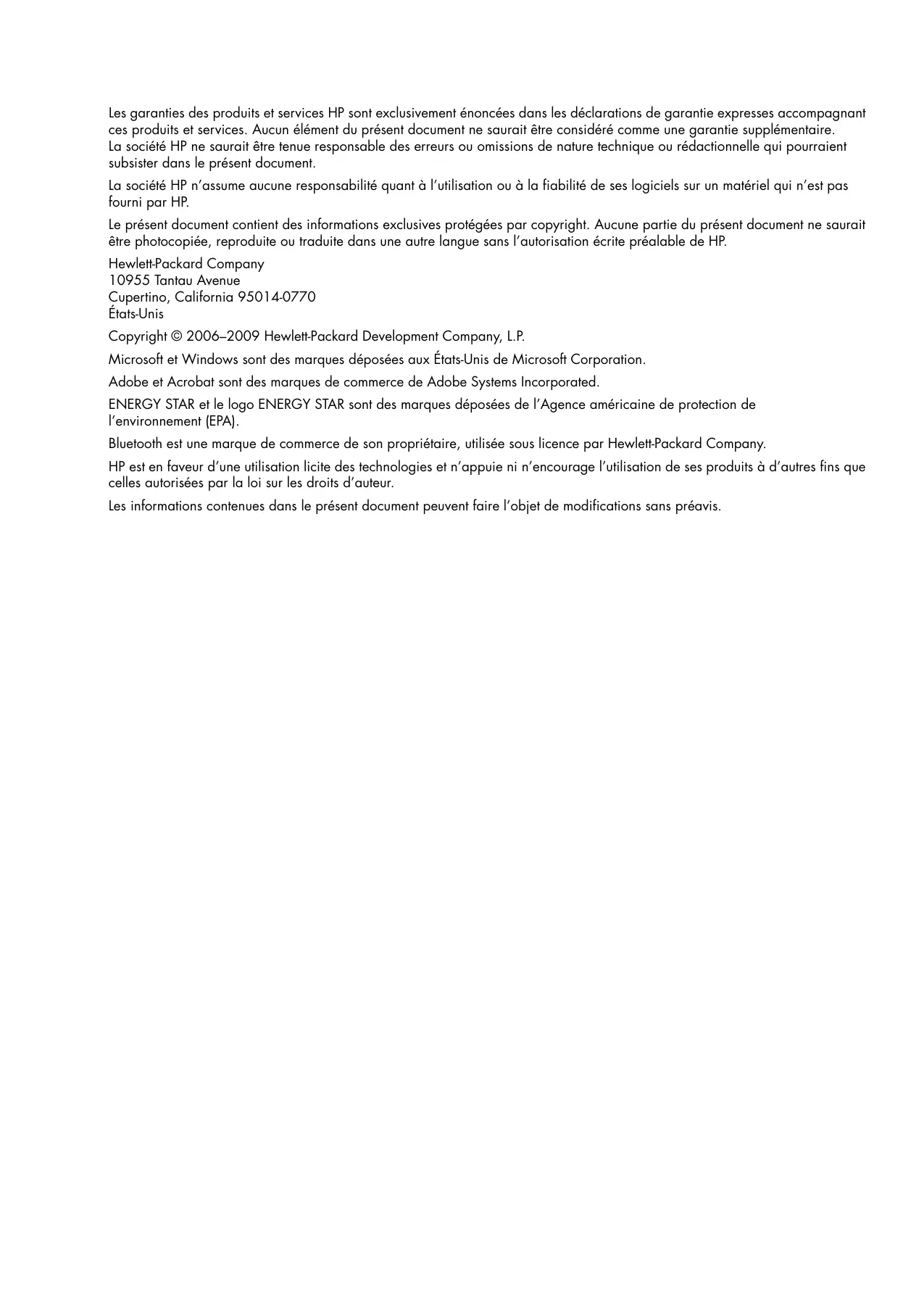 Manuel de l’utilisateur 1859m 2009m/v/f 2159m/v 2309m/v Les garanties des produits et services HP sont exclusivement énoncées dans les déclarations de garantie expresses accompagnant ces produits et services. Aucun élément du présent document ne saurait être considéré comme une garantie supplémentaire. La société HP ne saurait être tenue responsable des erreurs ou omissions de nature technique ou rédactionnelle qui pourraient subsister dans le présent document. La société HP n’assume aucune responsabilité quant à l’utilisation ou à la fiabilité de ses logiciels sur un matériel qui n’est pas fourni par HP. Le présent document contient des informations exclusives protégées par copyright. Aucune partie du présent document ne saurait être photocopiée, reproduite ou traduite dans une autre langue sans l’autorisation écrite préalable de HP. Hewlett-Packard Company 10955 Tantau Avenue Cupertino, California 95014-0770 États-Unis Copyright © 2006–2009 Hewlett-Packard Development Company, L.P. Microsoft et Windows sont des marques déposées aux États-Unis de Microsoft Corporation. Adobe et Acrobat sont des marques de commerce de Adobe Systems Incorporated. ENERGY STAR et le logo ENERGY STAR sont des marques déposées de l’Agence américaine de protection de l’environnement (EPA). Bluetooth est une marque de commerce de son propriétaire, utilisée sous licence par Hewlett-Packard Company. HP est en faveur d’une utilisation licite des technologies et n’appuie ni n’encourage l’utilisation de ses produits à d’autres fins que celles autorisées par la loi sur les droits d’auteur. Les informations contenues dans le présent document peuvent faire l’objet de modifications sans préavis. Conventions typographiques La section suivante décrit les conventions typographiques utilisées dans le présent document. Remarques, Précautions et Avertissements Dans ce guide, les blocs de texte peuvent être accompagnés d’une icône. Ces blocs présentent des remarques, précautions et avertissements, et ils sont utilisés de la manière suivante :