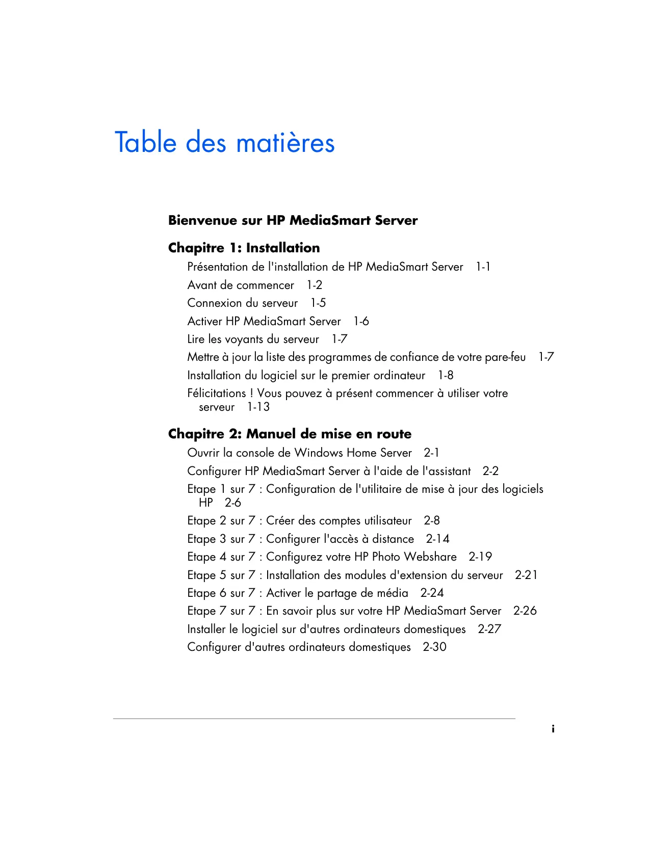 Ouvrir la console de Windows Home Server 2-1 Configurer HP MediaSmart Server à l'aide de l'assistant 2-2 Etape 1 sur 7 : Configuration de l'utilitaire de mise à jour des logiciels HP 2-6 Etape 2 sur 7 : Créer des comptes utilisateur 2-8 Etape 3 sur 7 : Configurer l'accès à distance 2-14 Etape 4 sur 7 : Configurez votre HP Photo Webshare 2-19 Etape 5 sur 7 : Installation des modules d'extension du serveur Etape 6 sur 7 : Activer le partage de média 2-21 2-24 Etape 7 sur 7 : En savoir plus sur votre HP MediaSmart Server 2-26 Installer le logiciel sur d'autres ordinateurs domestiques 2-27 Configurer d'autres ordinateurs domestiques 2-30