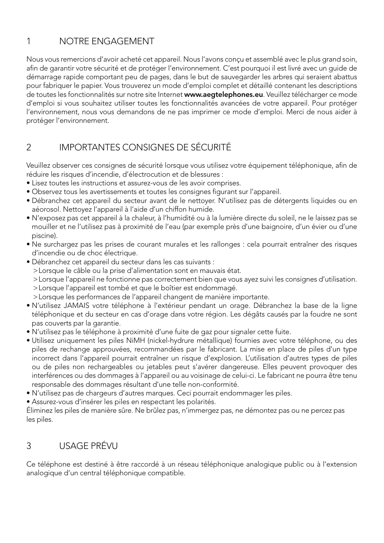 NOTRE ENGAGEMENT Nous vous remercions d‘avoir acheté cet appareil. Nous l’avons conçu et assemblé avec le plus grand soin, afin de garantir votre sécurité et de protéger l’environnement. C’est pourquoi il est livré avec un guide de démarrage rapide comportant peu de pages, dans le but de sauvegarder les arbres qui seraient abattus pour fabriquer le papier. Vous trouverez un mode d’emploi complet et détaillé contenant les descriptions de toutes les fonctionnalités sur notre site Internet www.aegtelephones.eu. Veuillez télécharger ce mode d’emploi si vous souhaitez utiliser toutes les fonctionnalités avancées de votre appareil. Pour protéger l’environnement, nous vous demandons de ne pas imprimer ce mode d’emploi. Merci de nous aider à protéger l‘environnement.