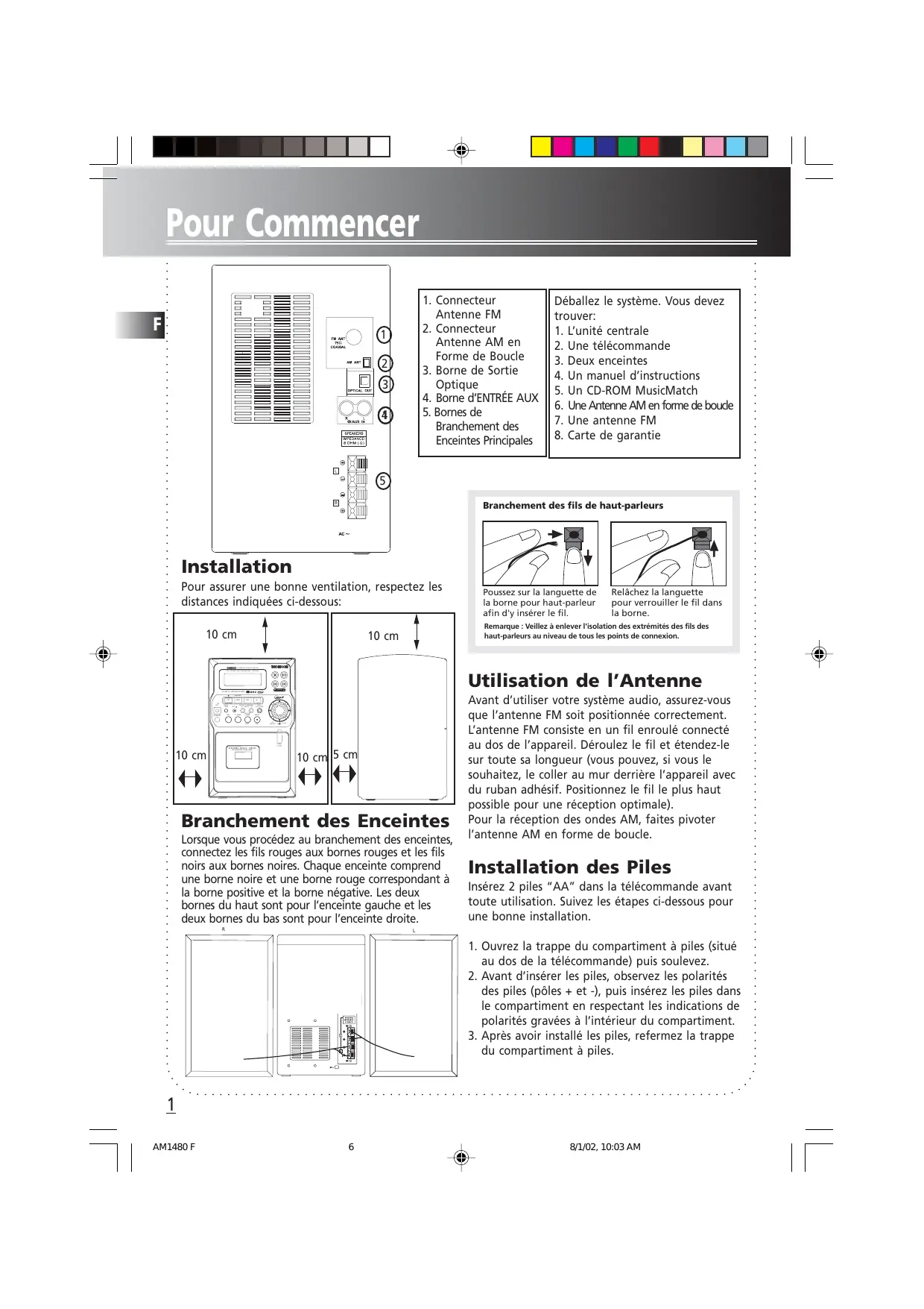 Branchement des fils de haut-parleurs Installation Pour assurer une bonne ventilation, respectez les distances indiquées ci-dessous: 10 cm