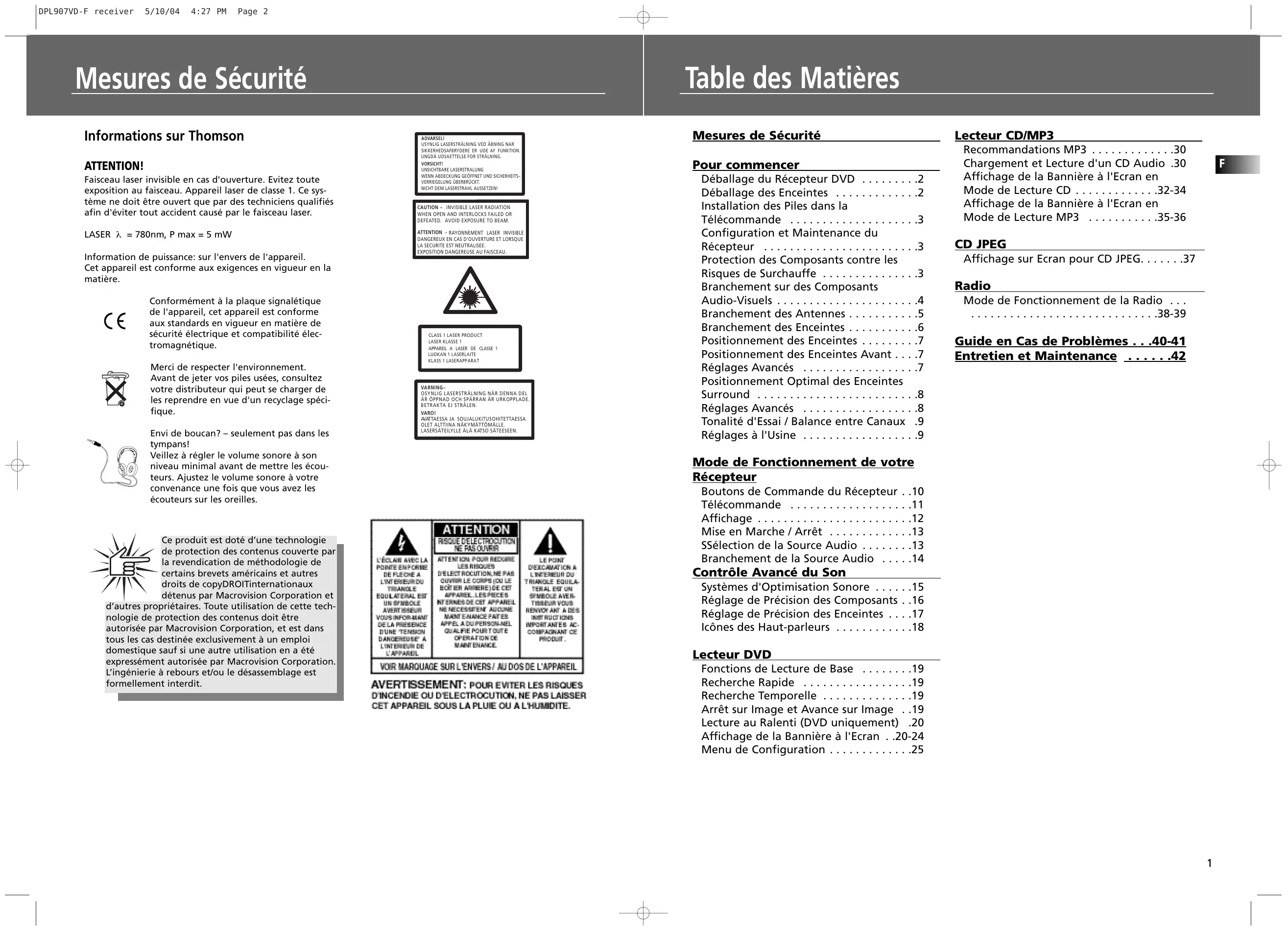 DPL907VD-F receiver 5/10/04 4:27 PM Page 2 Table des Matières Mesures de Sécurité Informations sur Thomson ATTENTION! Faisceau laser invisible en cas d'ouverture. Evitez toute exposition au faisceau. Appareil laser de classe 1. Ce système ne doit être ouvert que par des techniciens qualifiés afin d'éviter tout accident causé par le faisceau laser. LASER λ = 780nm, P max = 5 mW Information de puissance: sur l'envers de l'appareil. Cet appareil est conforme aux exigences en vigueur en la matière. Conformément à la plaque signalétique de l'appareil, cet appareil est conforme aux standards en vigueur en matière de sécurité électrique et compatibilité électromagnétique. Merci de respecter l'environnement. Avant de jeter vos piles usées, consultez votre distributeur qui peut se charger de les reprendre en vue d'un recyclage spécifique. Envi de boucan? – seulement pas dans les tympans! Veillez à régler le volume sonore à son niveau minimal avant de mettre les écouteurs. Ajustez le volume sonore à votre convenance une fois que vous avez les écouteurs sur les oreilles. Ce produit est doté d’une technologie de protection des contenus couverte par la revendication de méthodologie de certains brevets américains et autres droits de copyDROITinternationaux détenus par Macrovision Corporation et d’autres propriétaires. Toute utilisation de cette technologie de protection des contenus doit être autorisée par Macrovision Corporation, et est dans tous les cas destinée exclusivement à un emploi domestique sauf si une autre utilisation en a été expressément autorisée par Macrovision Corporation. L’ingénierie à rebours et/ou le désassemblage est formellement interdit. ADVARSEL!