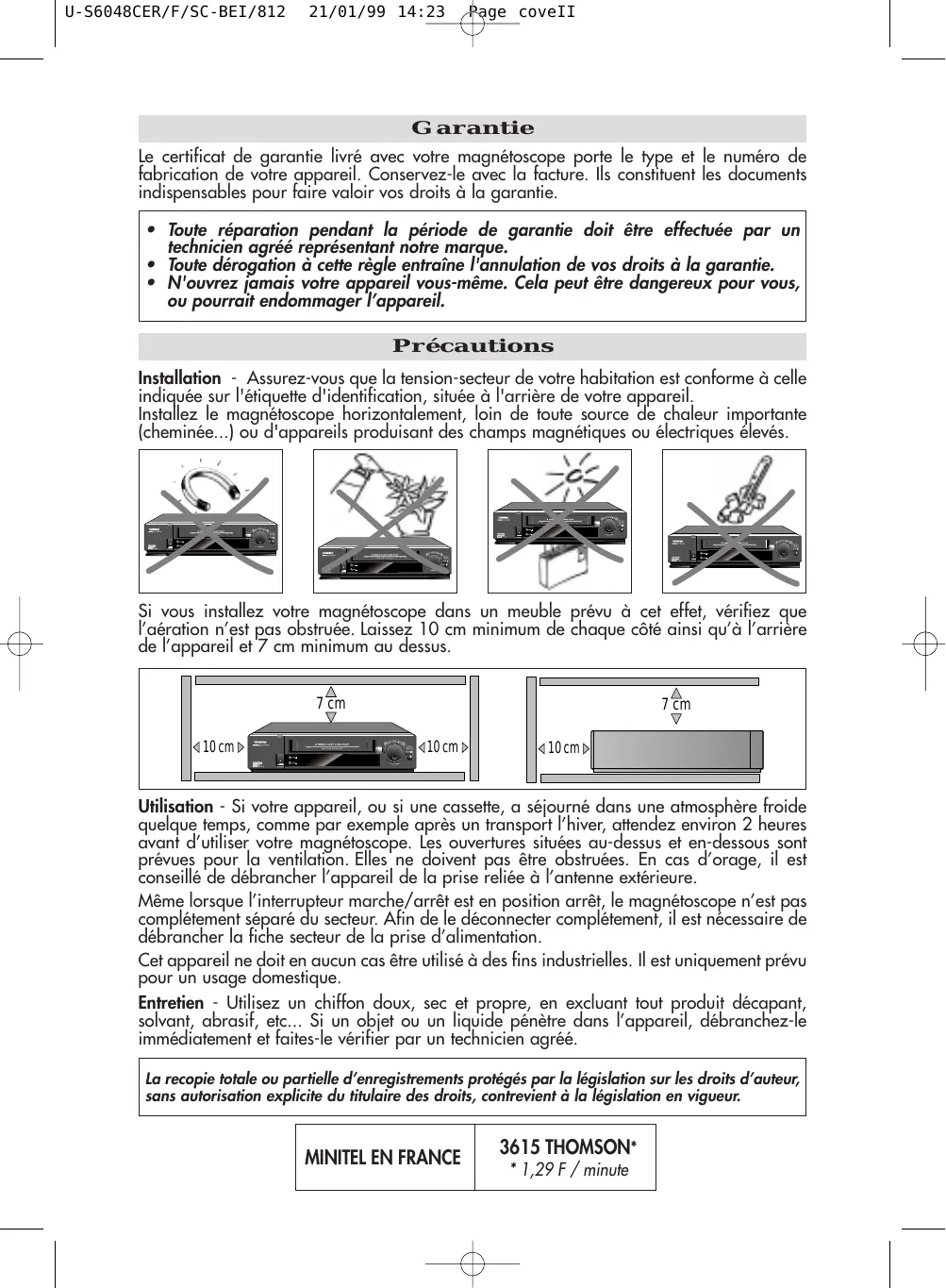 21/01/99 14:23 Page coveII Garantie Le certificat de garantie livré avec votre magnétoscope porte le type et le numéro de fabrication de votre appareil. Conservez-le avec la facture. Ils constituent les documents indispensables pour faire valoir vos droits à la garantie.