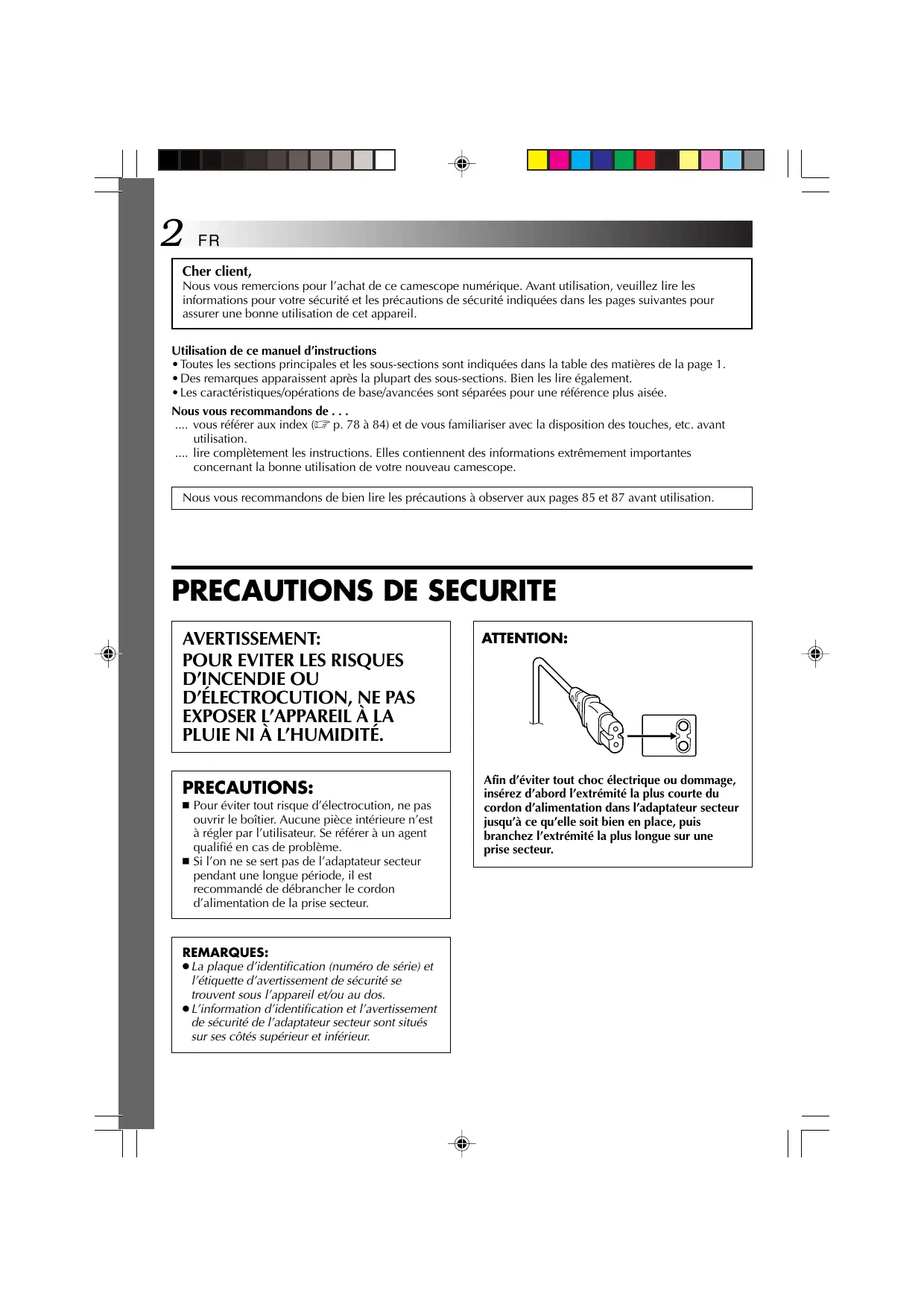 PLUIE NI À L’HUMIDITÉ. ATTENTION: PRECAUTIONS: Afin d’éviter tout choc électrique ou dommage, insérez d’abord l’extrémité la plus courte du cordon d’alimentation dans l’adaptateur secteur jusqu’à ce qu’elle soit bien en place, puis branchez l’extrémité la plus longue sur une prise secteur. 䡲 Pour éviter tout risque d’électrocution, ne pas ouvrir le boîtier. Aucune pièce intérieure n’est à régler par l’utilisateur. Se référer à un agent qualifié en cas de problème. 䡲 Si l’on ne se sert pas de l’adaptateur secteur pendant une longue période, il est recommandé de débrancher le cordon d’alimentation de la prise secteur. REMARQUES: ● La plaque d’identification (numéro de série) et l’étiquette d’avertissement de sécurité se trouvent sous l’appareil et/ou au dos. ● L’information d’identification et l’avertissement de sécurité de l’adaptateur secteur sont situés sur ses côtés supérieur et inférieur. F R PRECAUTIONS: ● Ce camescope est conçu pour être utilisé avec les signaux de télévision couleur de type PAL. Il ne peut pas être utilisé pour la lecture sur un téléviseur de standard différent. Cependant, l’enregistrement en direct et la lecture sur l’écran LCD/dans le viseur sont possibles n’importe où. ● Utiliser la batterie BAT600 et, pour la recharger ou fournir l’alimentation au camescope à partir d’une prise secteur, utiliser l’adaptateur secteur multi-tensions fourni et le cordon d’alimentation fourni. (Un adaptateur de conversion adéquat risque d’être nécessaire pour le branchement sur les prises secteur de formes différentes selon les pays.) Si le matériel est installé dans un coffret ou sur une étagère, s’assurer qu’il y a un espace suffisant sur tous les côtés pour permettre la ventilation (10 cm ou plus sur les deux côtés, au dessus et à l’arrière). Ne pas boucher les orifices de ventilation. (Si les orifices de ventilation sont bouchés par un journal, un tissu, etc., la chaleur peut ne pas s’évacuer.) Aucune source à flamme nue, telle que des bougies allumées, ne doit être placée sur l’appareil. Avant de vous débarrasser des batteries, respectez l’environnement et les réglementations locales ou la législation concernant le rebut de ces batteries. L’appareil ne doit pas être exposé à l’eau, ni aux éclaboussures. Ne pas utiliser cet appareil dans une salle de bains, ni dans des endroits avec de l’eau. Ne pas placer de récipient rempli d’eau ou de liquides (tels des produits cosmétiques, des médicaments, des vases de fleurs, des plantes en pot, des tasses, etc.) sur le dessus de cet appareil. (Si de l’eau ou un liquide pénètre dans l’appareil, un incendie ou un choc électrique risque de se produire.)