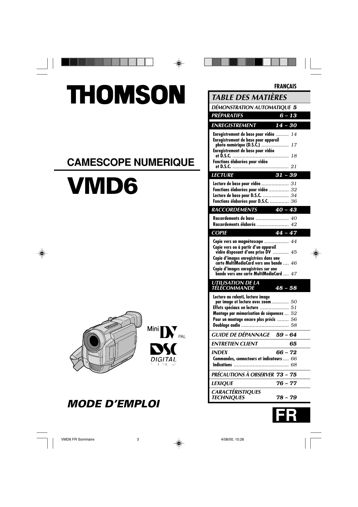 VMD6 - Caméscope THOMSON - Notice d'utilisation et mode d'emploi gratuit