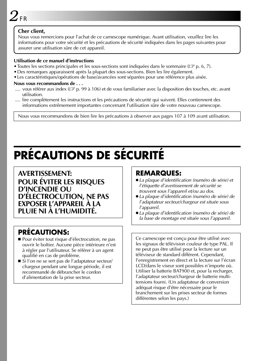 PLUIE NI À L’HUMIDITÉ. PRÉCAUTIONS: 䡲 Pour éviter tout risque d’électrocution, ne pas ouvrir le boîtier. Aucune pièce intérieure n’est à régler par l’utilisateur. Se référer à un agent qualifié en cas de problème. 䡲 Si l’on ne se sert pas de l’adaptateur secteur/ chargeur pendant une longue période, il est recommandé de débrancher le cordon d’alimentation de la prise secteur. REMARQUES: ● La plaque d’identification (numéro de série) et l’étiquette d’avertissement de sécurité se trouvent sous l’appareil et/ou au dos. ● La plaque d’identification (numéro de série) de l’adaptateur secteur/chargeur est située sous l’appareil. ● La plaque d’identification (numéro de série) de la base de montage est située sous l’appareil. Ce camescope est conçu pour être utilisé avec les signaux de télévision couleur de type PAL. Il ne peut pas être utilisé pour la lecture sur un téléviseur de standard différent. Cependant, l’enregistrement en direct et la lecture sur l’écran LCD/dans le viseur sont possibles n’importe où. Utiliser la batterie BAT900 et, pour la recharger, l’adaptateur secteur/chargeur de batterie multitensions fourni. (Un adaptateur de conversion adéquat risque d’être nécessaire pour le branchement sur les prises secteur de formes différentes selon les pays.)