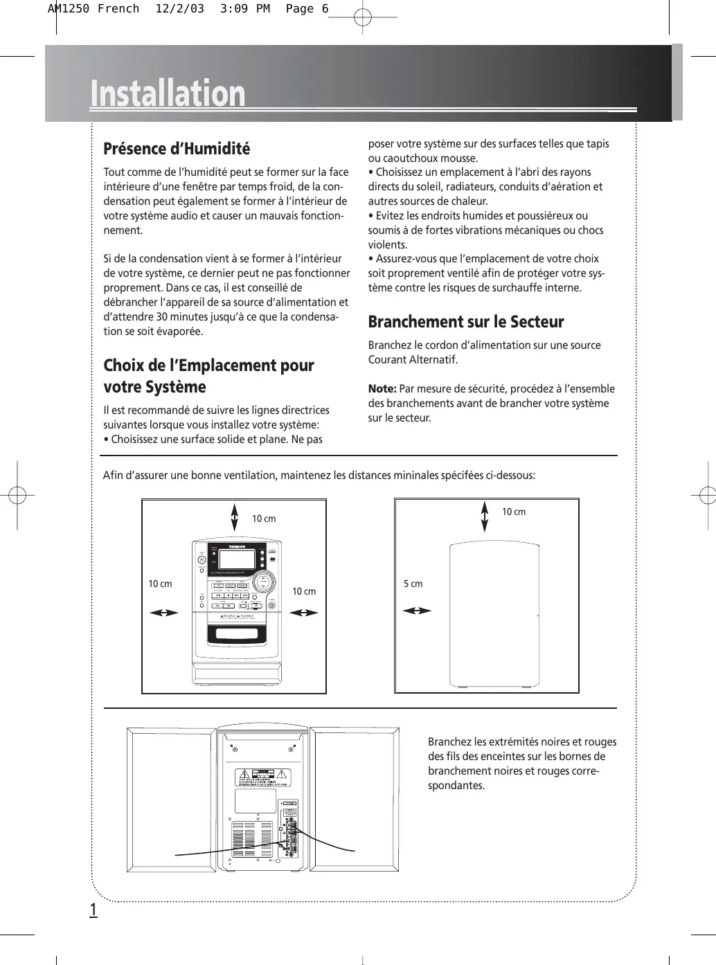 AM1250 French 12/2/03 3:09 PM Page 6 Installation Présence d’Humidité Tout comme de l’humidité peut se former sur la face intérieure d’une fenêtre par temps froid, de la condensation peut également se former à l’intérieur de votre système audio et causer un mauvais fonctionnement. Si de la condensation vient à se former à l’intérieur de votre système, ce dernier peut ne pas fonctionner proprement. Dans ce cas, il est conseillé de débrancher l’appareil de sa source d’alimentation et d’attendre 30 minutes jusqu’à ce que la condensation se soit évaporée. Choix de l’Emplacement pour votre Système Il est recommandé de suivre les lignes directrices suivantes lorsque vous installez votre système: