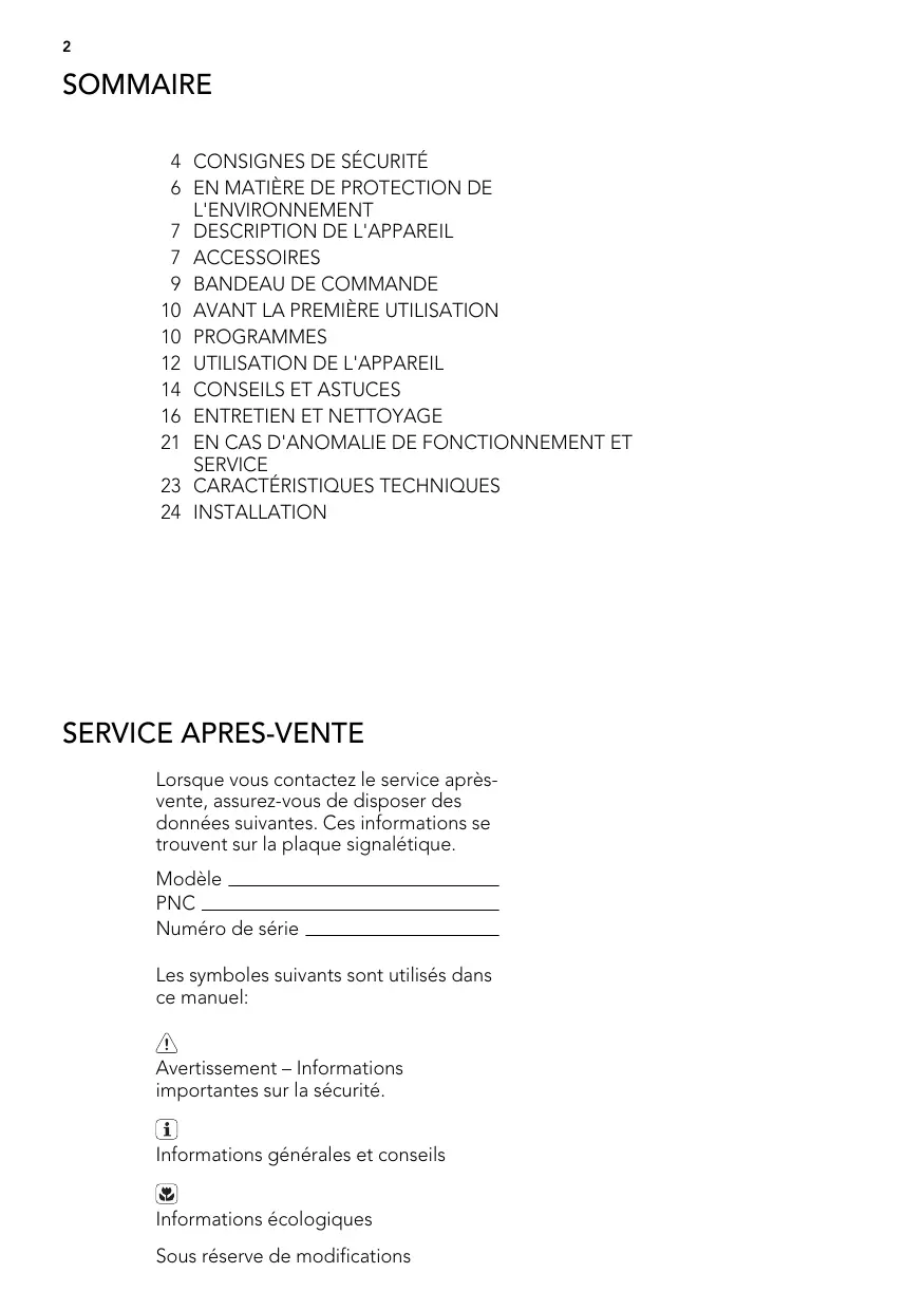 24 INSTALLATION SERVICE APRES-VENTE Lorsque vous contactez le service aprèsvente, assurez-vous de disposer des données suivantes. Ces informations se trouvent sur la plaque signalétique. Modèle PNC Numéro de série Les symboles suivants sont utilisés dans ce manuel: Avertissement – Informations importantes sur la sécurité. Informations générales et conseils Informations écologiques Sous réserve de modifications FRANÇAIS
