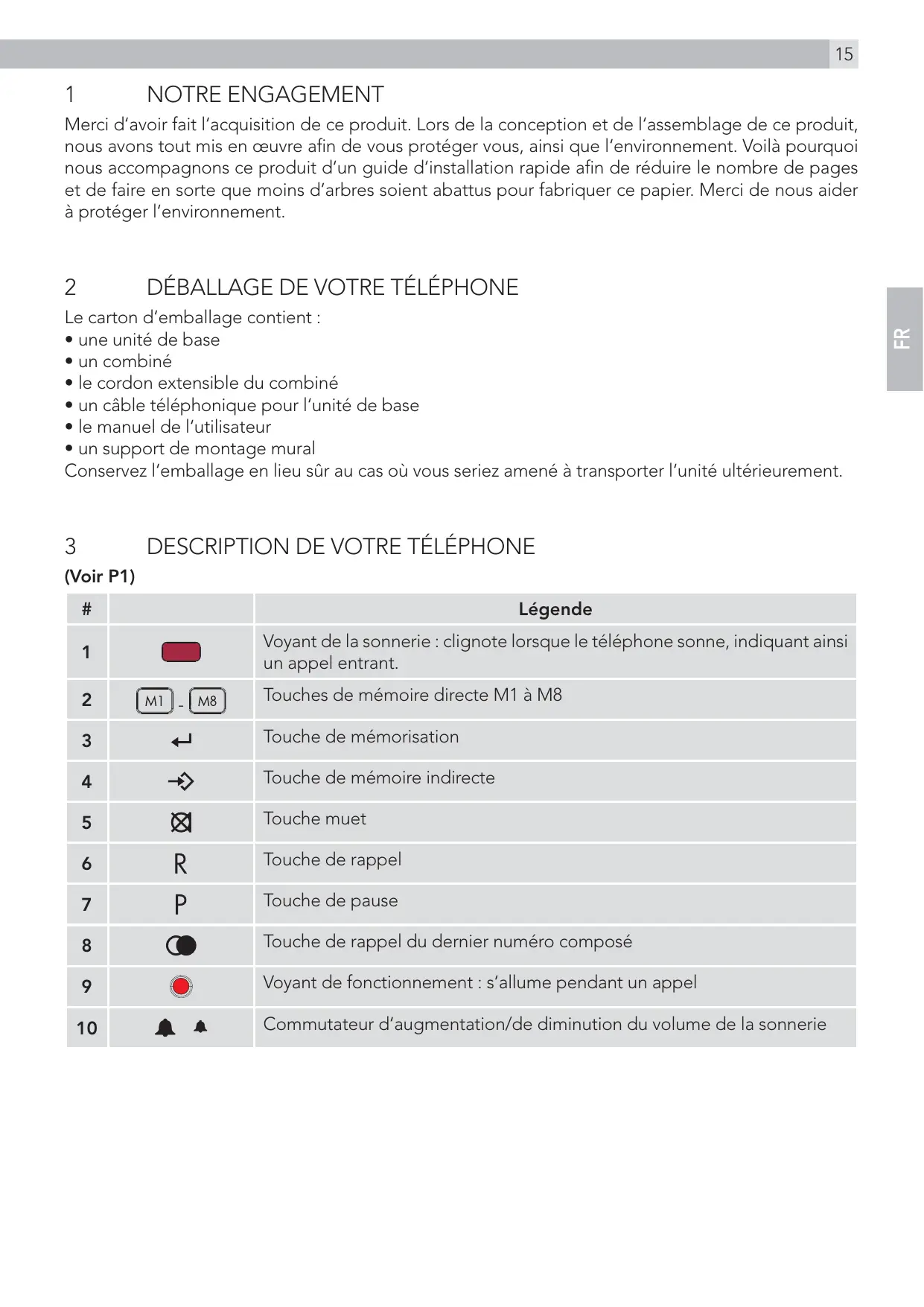 NOTRE ENGAGEMENT Merci d‘avoir fait l‘acquisition de ce produit. Lors de la conception et de l‘assemblage de ce produit, nous avons tout mis en œuvre afin de vous protéger vous, ainsi que l‘environnement. Voilà pourquoi nous accompagnons ce produit d‘un guide d‘installation rapide afin de réduire le nombre de pages et de faire en sorte que moins d’arbres soient abattus pour fabriquer ce papier. Merci de nous aider à protéger l‘environnement. DÉBALLAGE DE VOTRE TÉLÉPHONE Le carton d‘emballage contient : tune unité de base tun combiné tle cordon extensible du combiné tun câble téléphonique pour l‘unité de base tle manuel de l‘utilisateur tun support de montage mural Conservez l‘emballage en lieu sûr au cas où vous seriez amené à transporter l‘unité ultérieurement.