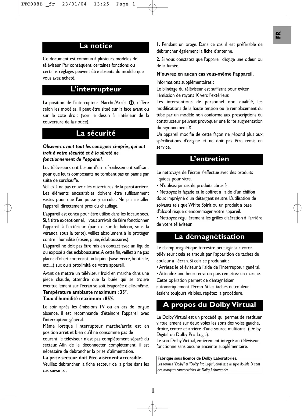 ITC008B+_fr 23/01/04 13:25 Page 2 Mise en service Suivez les instructions de cette page pour mettre en service votre téléviseur et sa télécommande avant d'accéder à la procédure d'installation des chaînes décrite en page 4. alternative de 220 - 240 V ~ 50 Hz. Il ne doit pas être raccordé à un réseau délivrant du courant continu. Si la fiche est détachée du cordon, ne la branchez en aucun cas à une prise secteur car il y a danger d’électrocution. PRISE SECTEUR AU ROYAUME-UNI : Les appareils prévus pour le Royaume-Uni sont livrés avec un cordon secteur équipé d’une prise moulée. Cette prise contient des éléments de sécurité qu’il ne faut pas remplacer par un modèle quelconque du commerce. Elle est munie d’un fusible qui protège votre téléviseur. Si votre appareil ne fonctionne plus, le fusible peut être fondu. Dans ce cas, remplacez-le par un fusible identique de 5 ampères certifié par l’ASTA ou le BSI (BS 1362).