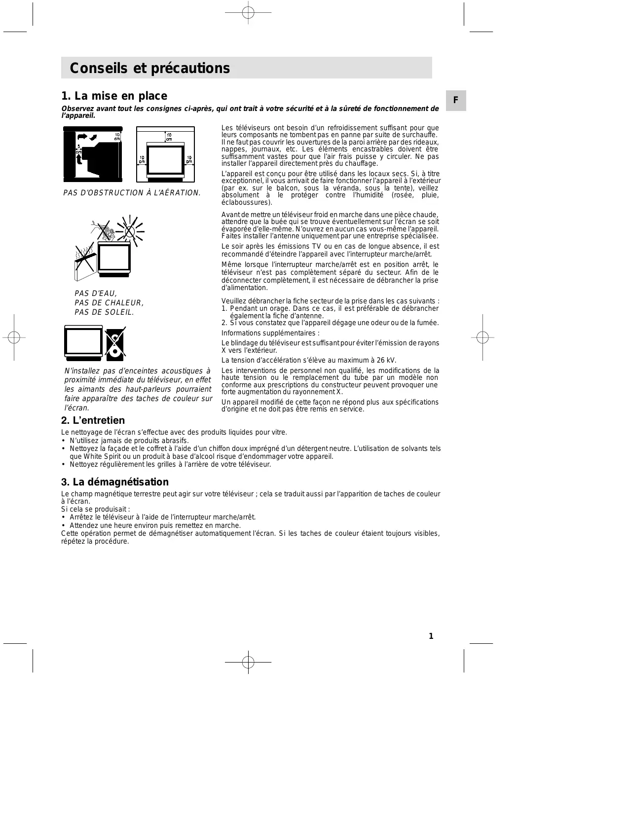 Observez avant tout les consignes ci-après, qui ont trait à votre sécurité et à la sûreté de fonctionnement de l’appareil. PAS D’OBSTRUCTION À L’AÉRATION. PAS D’EAU, PAS DE CHALEUR, PAS DE SOLEIL. N’installez pas d’enceintes acoustiques à proximité immédiate du téléviseur, en effet les aimants des haut-parleurs pourraient faire apparaître des taches de couleur sur l’écran. Les téléviseurs ont besoin d’un refroidissement suffisant pour que leurs composants ne tombent pas en panne par suite de surchauffe. Il ne faut pas couvrir les ouvertures de la paroi arrière par des rideaux, nappes, journaux, etc. Les éléments encastrables doivent être suffisamment vastes pour que l’air frais puisse y circuler. Ne pas installer l’appareil directement près du chauffage. L’appareil est conçu pour être utilisé dans les locaux secs. Si, à titre exceptionnel, il vous arrivait de faire fonctionner l’appareil à l’extérieur (par ex. sur le balcon, sous la véranda, sous la tente), veillez absolument à le protéger contre l’humidité (rosée, pluie, éclaboussures). Avant de mettre un téléviseur froid en marche dans une pièce chaude, attendre que la buée qui se trouve éventuellement sur l’écran se soit évaporée d’elle-même. N’ouvrez en aucun cas vous-même l’appareil. Faites installer l’antenne uniquement par une entreprise spécialisée. Le soir après les émissions TV ou en cas de longue absence, il est recommandé d’éteindre l’appareil avec l’interrupteur marche/arrêt. Même lorsque l’interrupteur marche/arrêt est en position arrêt, le téléviseur n’est pas complètement séparé du secteur. Afin de le déconnecter complètement, il est nécessaire de débrancher la prise d’alimentation. Veuillez débrancher la fiche secteur de la prise dans les cas suivants :