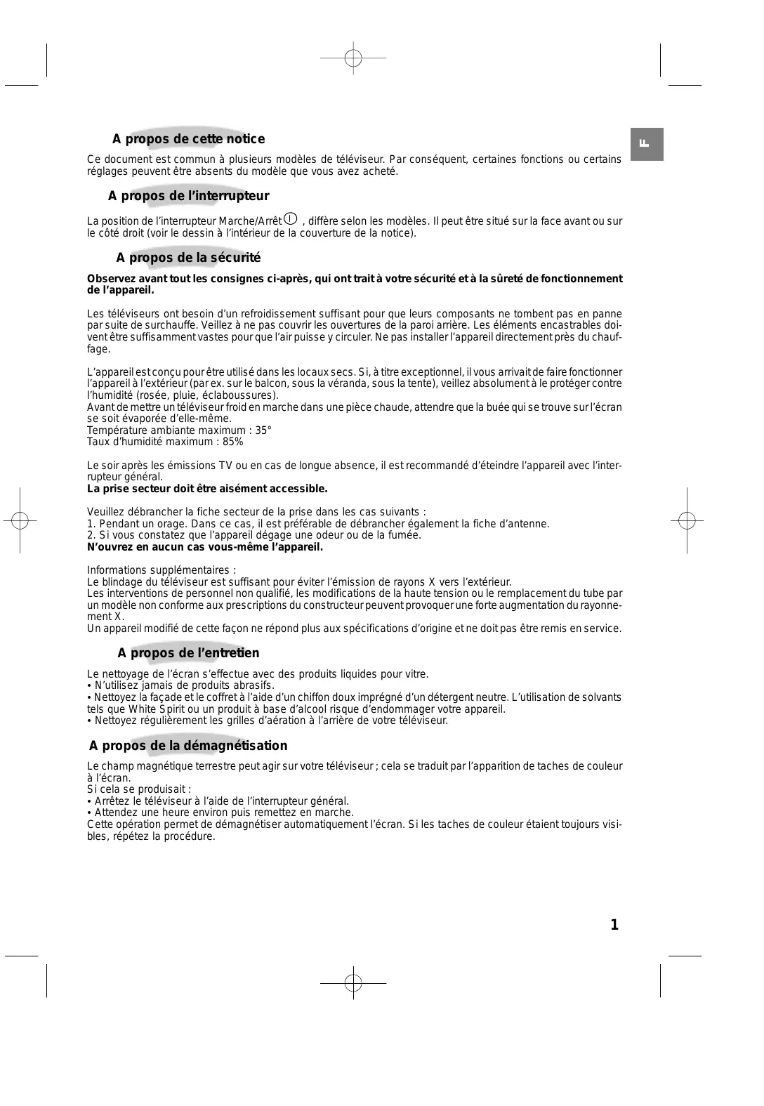 N’ouvrez en aucun cas vous-même l’appareil. Informations supplémentaires : Le blindage du téléviseur est suffisant pour éviter l’émission de rayons X vers l’extérieur. Les interventions de personnel non qualifié, les modifications de la haute tension ou le remplacement du tube par un modèle non conforme aux prescriptions du constructeur peuvent provoquer une forte augmentation du rayonnement X. Un appareil modifié de cette façon ne répond plus aux spécifications d’origine et ne doit pas être remis en service. A propos de l’entretien Le nettoyage de l’écran s’effectue avec des produits liquides pour vitre. : N’utilisez jamais de produits abrasifs. : Nettoyez la façade et le coffret à l’aide d’un chiffon doux imprégné d’un détergent neutre. L’utilisation de solvants tels que White Spirit ou un produit à base d’alcool risque d’endommager votre appareil. : Nettoyez régulièrement les grilles d’aération à l’arrière de votre téléviseur. A propos de la démagnétisation Le champ magnétique terrestre peut agir sur votre téléviseur ; cela se traduit par l’apparition de taches de couleur à l’écran. Si cela se produisait : : Arrêtez le téléviseur à l’aide de l’interrupteur général. : Attendez une heure environ puis remettez en marche. Cette opération permet de démagnétiser automatiquement l’écran. Si les taches de couleur étaient toujours visibles, répétez la procédure.