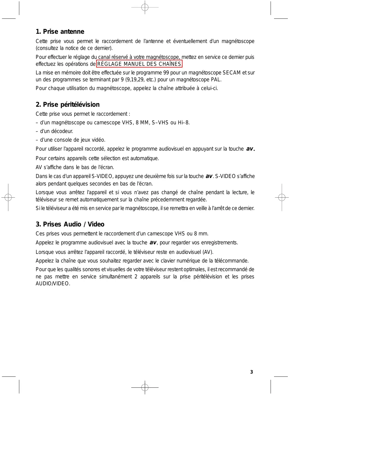 Cette prise vous permet le raccordement : – d’un magnétoscope ou camescope VHS, 8 MM, S–VHS ou Hi–8. – d’un décodeur. – d’une console de jeux vidéo. Pour utiliser l’appareil raccordé, appelez le programme audiovisuel en appuyant sur la touche av . Pour certains appareils cette sélection est automatique. AV s’affiche dans le bas de l’écran. Dans le cas d’un appareil S-VIDEO, appuyez une deuxième fois sur la touche av . S-VIDEO s’affiche alors pendant quelques secondes en bas de l’écran. Lorsque vous arrêtez l’appareil et si vous n’avez pas changé de chaîne pendant la lecture, le téléviseur se remet automatiquement sur la chaîne précedemment regardée. Si le téléviseur a été mis en service par le magnétoscope, il se remettra en veille à l’arrêt de ce dernier.