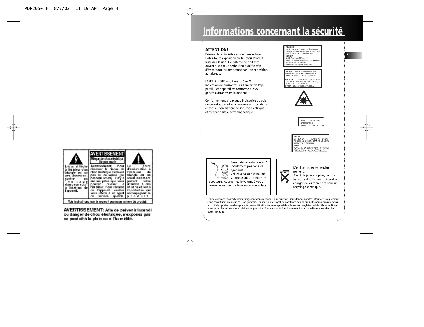 PDP2050 PDP2050 F 8/7/02 11:19 AM Page 4 Informations concernant la sécurité ATTENTION! Faisceau laser invisible en cas d'ouverture. Evitez toute exposition au faisceau. Produit laser de Classe 1. Ce système ne doit être ouvert que par un technicien qualifié afin d'éviter tout incident causé par une exposition au faisceau. LASER λ = 780 nm, P max = 5 mW Indication de puissance: Sur l'envers de l'appareil. Cet appareil est conforme aux exigences existantes en la matière. ADVARSEL!