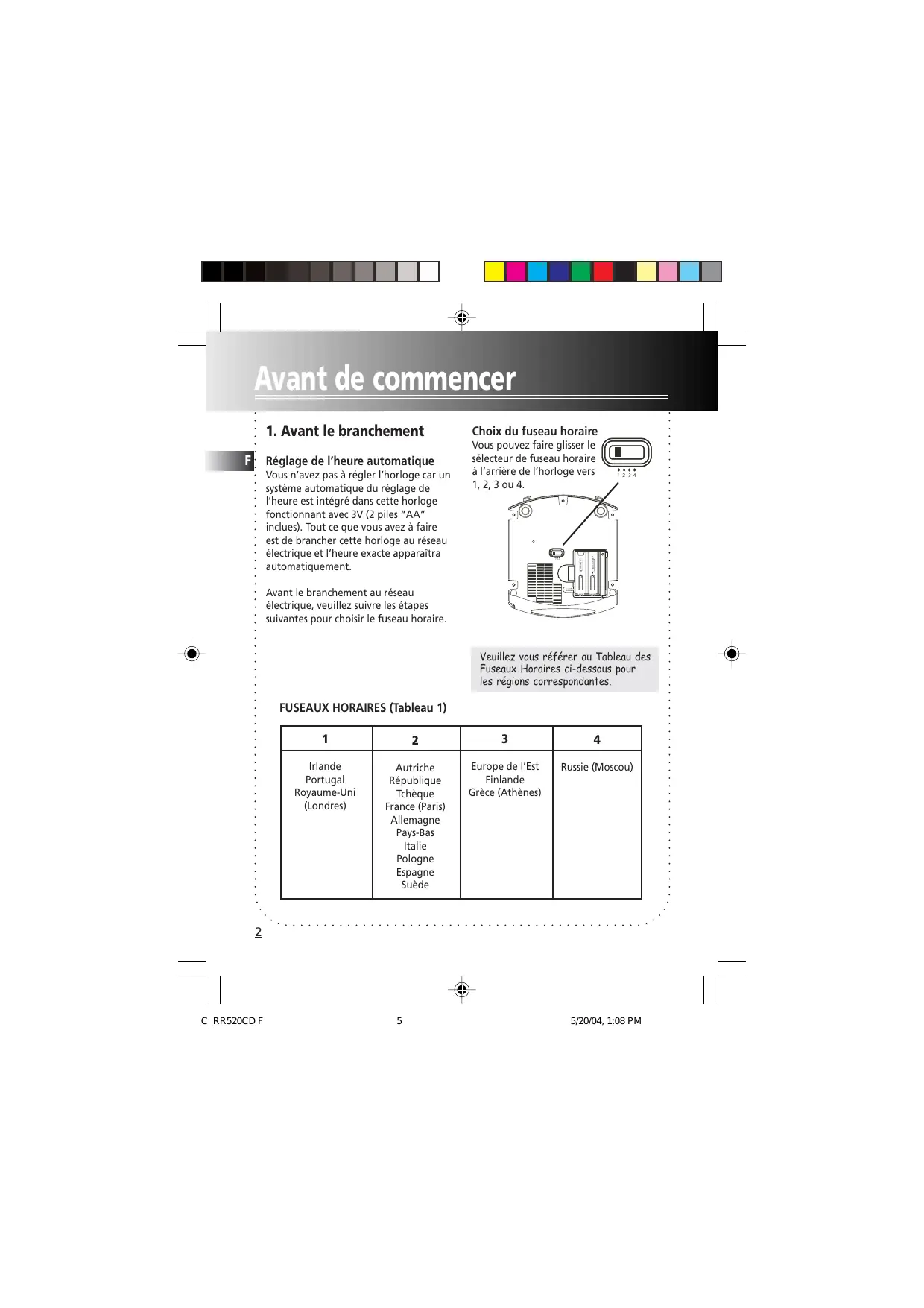5/20/04, 1:08 PM Avant de commencer Réglage de l’heure automatique Vous pouvez faire glisser le sélecteur de fuseau horaire à l’arrière de l’horloge vers 1, 2, 3 ou 4. Vous n’avez pas à régler l’horloge car un système automatique du réglage de l’heure est intégré dans cette horloge fonctionnant avec 3V (2 piles “AA” inclues). Tout ce que vous avez à faire est de brancher cette horloge au réseau électrique et l’heure exacte apparaîtra automatiquement.