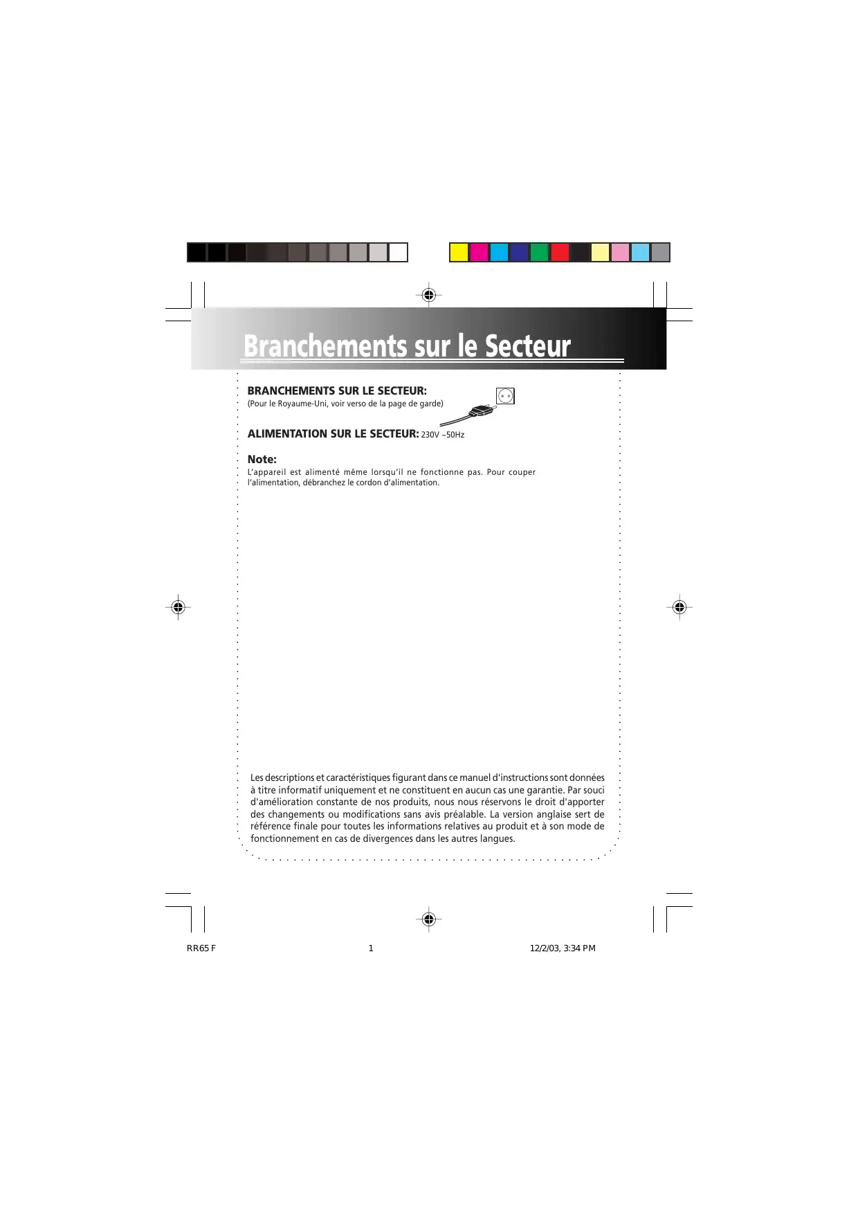 Branchements sur le Secteur BRANCHEMENTS SUR LE SECTEUR: (Pour le Royaume-Uni, voir verso de la page de garde) ALIMENTATION SUR LE SECTEUR: 230V ~50Hz Note: L’appareil est alimenté même lorsqu’il ne fonctionne pas. Pour couper l’alimentation, débranchez le cordon d’alimentation. Les descriptions et caractéristiques figurant dans ce manuel d'instructions sont données à titre informatif uniquement et ne constituent en aucun cas une garantie. Par souci d'amélioration constante de nos produits, nous nous réservons le droit d'apporter des changements ou modifications sans avis préalable. La version anglaise sert de référence finale pour toutes les informations relatives au produit et à son mode de fonctionnement en cas de divergences dans les autres langues. RR65 F