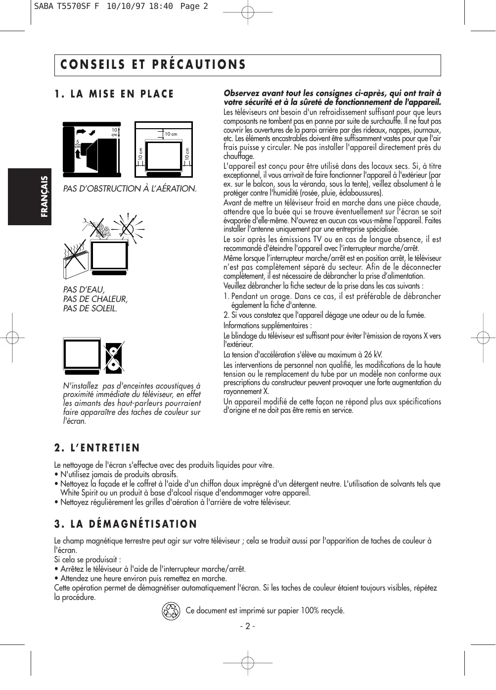 - Attendez une heure environ puis remettez en marche. Cette opération permet de démagnétiser automatiquement l'écran. Si les taches de couleur étaient toujours visibles, répétez la procédure. Ce document est imprimé sur papier 100% recyclé.
